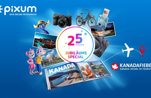 Pixum gibt den Startschuss für sein exklusives Jubiläums-Gewinnspiel! Anlässlich der Unternehmensgründung vor 25 Jahren veranstaltet der Online-Fotoservice eine große Verlosungsaktion, bei der mehr als 1.300 Preise im Gesamtwert von über 100.000 Euro auf die Teilnehmenden warten. Die Aktion startet bereits am 13. Juni und läuft bis zum Ende des Jahres. Als Hauptpreis winkt eine unvergessliche Traumreise nach Kanada für zwei Personen im Wert von rund 20.000 Euro, die in Kooperation mit KANADAFIEBER bereitgestellt wird.