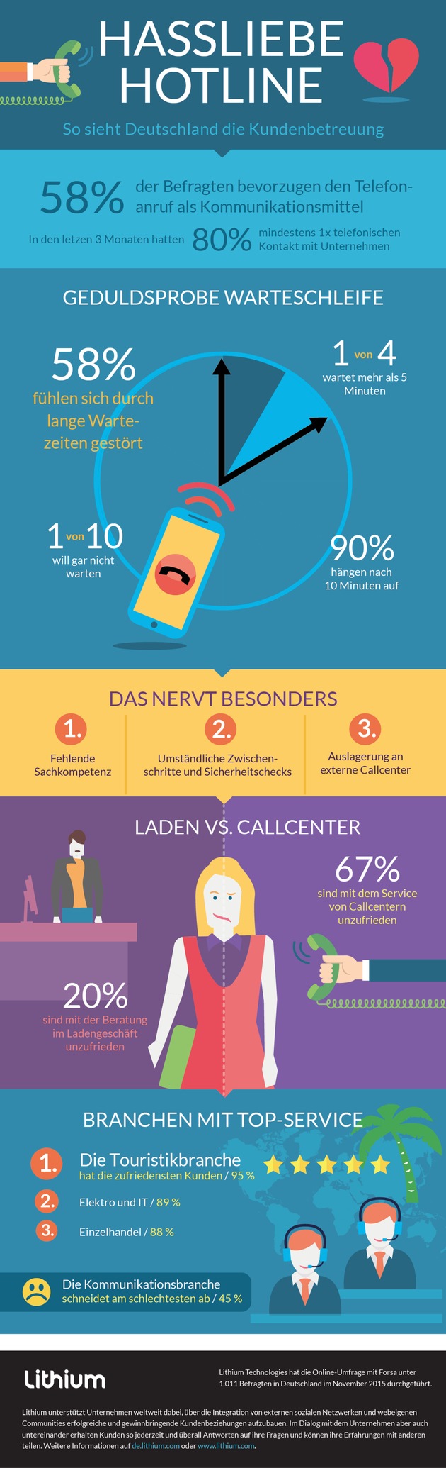 Dieser Angelegenheit ist Forsa im Auftrag von Lithium Technologies in einer Umfrage unter mehr als 1.000 Konsumenten nachgegangen. Dabei ging es vor allem um die Frage, auf welchem Weg sich Konsumenten an Unternehmen und Dienstleister wenden sowie ihre Einschätzung der Servicequalität. Erstes Kommunikationsmittel der Wahl ist und bleibt die Hotline: 62 Prozent der Konsumenten bevorzugen es, bei Fragen zum Hörer zu greifen, wobei 67 Prozent letztes Jahr damit negative Erfahrungen gemacht haben. Besonders schlecht wird der Kundenservice der Kommunikationsdienstleister wahrgenommen: Mehr als die Hälfte der Befragten (55 Prozent) haben mit ihrem Internetprovider oder Telekommunikationsanbieter bereits negative Erfahrungen gemacht. Nur 18 Prozent der Teilnehmer sahen über alle Branchen hinweg 2015 gar keinen Grund, über den Kundenservice zu klagen.