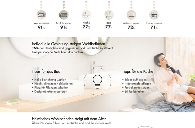 Bei der individuellen Gestaltung gibt es viel Luft nach oben 15 Prozent der Deutschen fühlen sich in ihrem Bad hingegen weder wohl noch unwohl, der Küche gegenüber sind 17 Prozent indifferent. Hier gibt es viel Potenzial für eine individuelle Gestaltung der Räume und der damit verbundenen Steigerung des Wohlbefindens. Das Bad lässt sich beispielsweise mit einer hellen Wand- und Bodenfarbe optisch vergrößern. Pflanzen brechen eine leblose oder kühle Atmosphäre auf. Designobjekte verleihen dem Ensemble einen edlen und individuellen Touch.