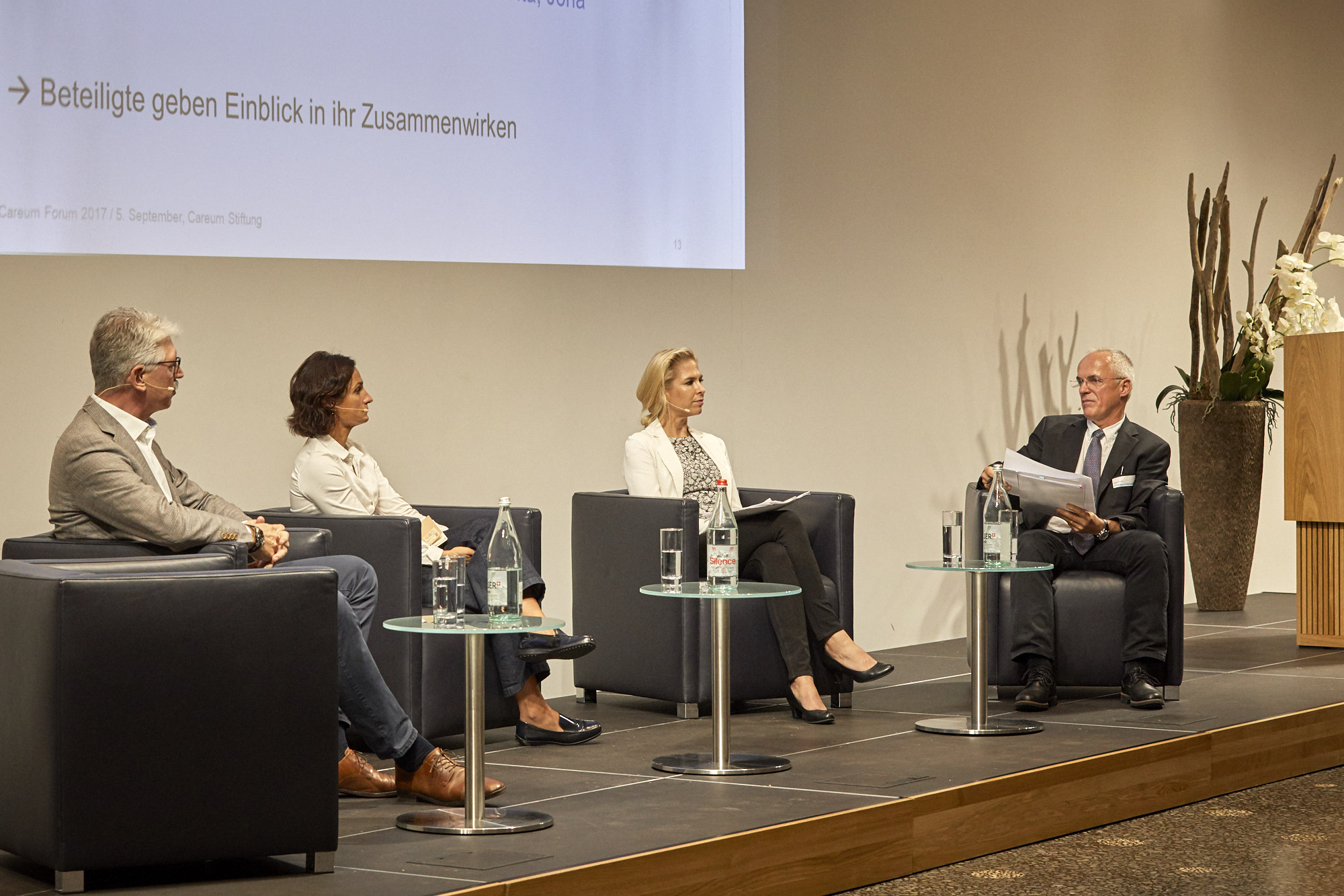 Herr und Frau Schweizer wollen auch bei Krankheit, Behinderung, Hochaltrigkeit und bis hin zum Tod zu Hause bleiben. «Der Bundesrat geht davon aus, dass sich dieser Trend in den nächsten Jahren sogar noch verdoppeln wird», sagte Hans Gut, Präsident der Careum Stiftung, in seiner Eröffnungsrede am Careum Forum vom 5. September 2017. Careum hat sich daher zur Aufgabe gemacht, auch Versorgungsfragen im Privathaushalt zu untersuchen. Die Lebensqualität und die Selbstbestimmung der Patientinnen und Patienten sind dabei zentral. Rund 170 Teilnehmende wollten am Forum im Auditorium auf dem Careum Campus in Zürich erfahren, wie Gesundheitsversorgung zu Hause gelingen kann. «DIE Lösung gibt es nicht», resümierte Marianne Pfister, Geschäftsführerin Spitex Schweiz, in der Schlussrunde. Aber es gebe viele Erfolgsfaktoren, die dazu beitragen, dass Gesundheitsversorgung zu Hause funktionieren kann. Zum Beispiel: Gute Fallkoordination, klare Zuständigkeiten, Kommunikation, transparente Dokumentation oder Arbeitgebende mit Verständnis für die Betreuungsaufgabe. Alternsforscher Prof. Dr. Ulrich Otto, Leiter Careum Forschung, fasste treffend zusammen: «Wir sind uns einig: Es kann gelingen, es braucht aber noch viel mehr Entschiedenheit.» Moderator Dr. Beat Sottas, Stiftungsrat und Mitglied des Leitenden Ausschusses von Careum, skizzierte die Ausgangslage und stellte klar: «Ohne pflegende Angehörige geht fast nichts.» Health Professionals und andere Akteure decken etwa eine Stunde im Tagesablauf ab, der Rest liegt in der Verantwortung der pflegenden Angehörigen. Umgerechnet entsprechen diese Leistungen in der Schweiz einem Wert von 3,5 Milliarden Schweizer Franken im Jahr.
