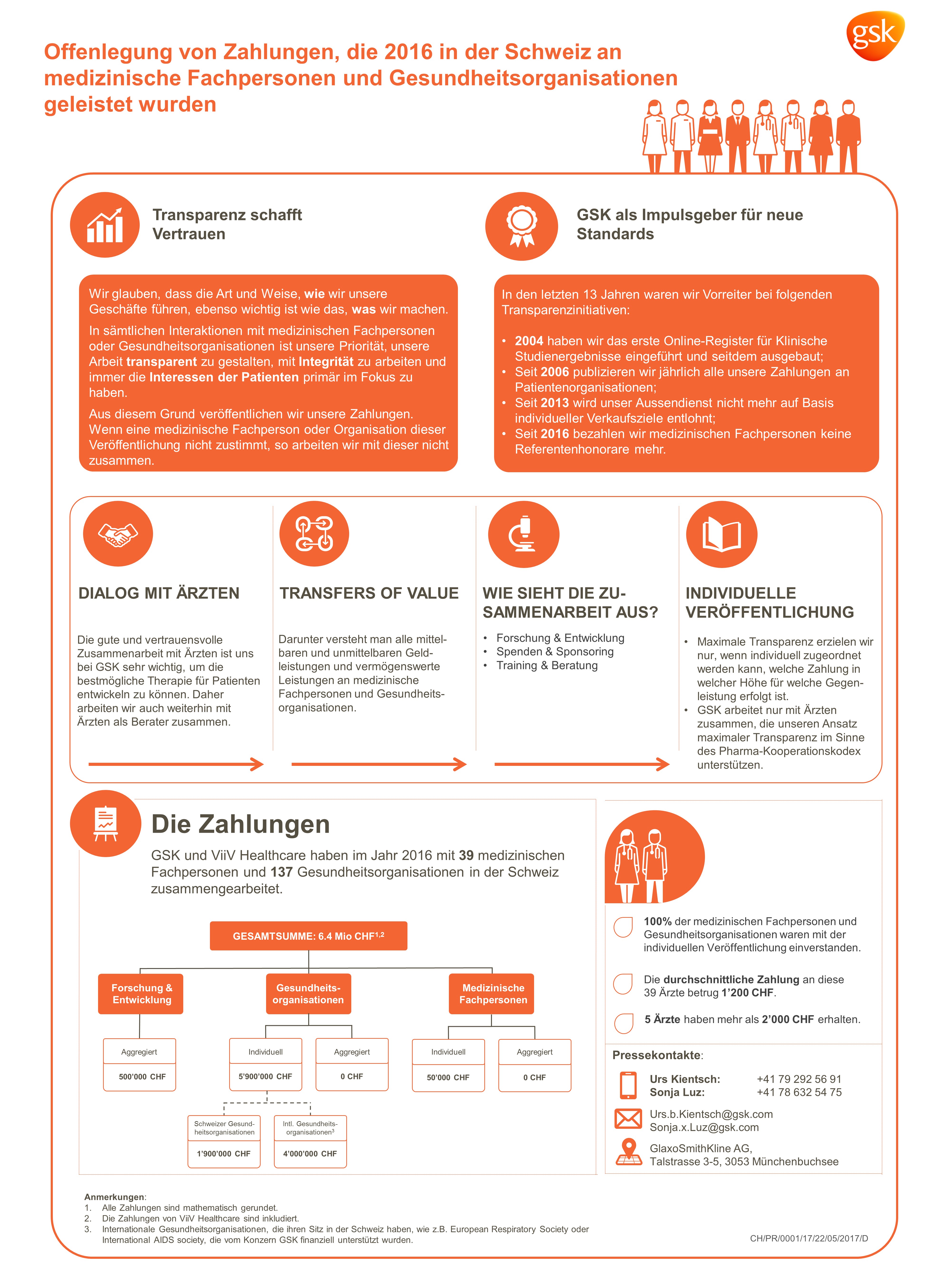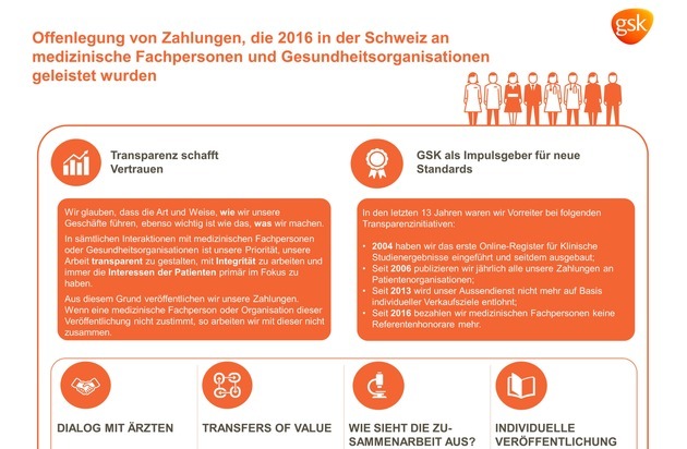 GSK ist seit Jahren Vorreiter, was die Schaffung von Transparenz betrifft, und geht dabei über die Branchenleitlinien hinaus. Zum zweiten Mal legt GSK ihre Zahlungen an medizinische Fachpersonen und Gesundheitsorganisationen auf ihrer Internetseite offen. Dies verschafft den Patienten Transparenz und stärkt das Vertrauen zwischen Ärzten, Patienten und Pharmaunternehmen. Dabei hat GSK den vom europäischen Pharmaverband EFPIA (European Federation of Pharmaceutical Industries and Associations) verabschiedeten «EFPIA Disclosure Code» entschlossen umgesetzt: So führte die "no consent-no contract"-Strategie bei GSK zu einer erfreulichen 100%igen Einwilligungsrate der Ärzte für eine namentliche Veröffentlichung.