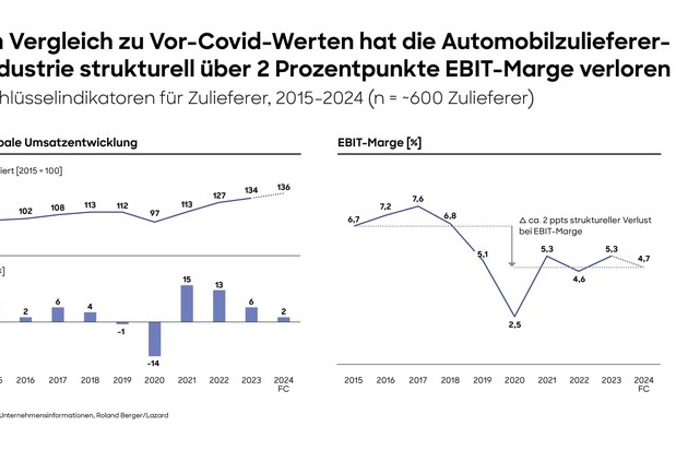 "Was wir derzeit vor allem in der europäischen und nordamerikanischen Automobilzulieferindustrie beobachten, lässt sich gut als eine Phase der 'Stagformation' beschreiben", sagt Felix Mogge, Partner bei Roland Berger. "Die Zulieferer erleben einerseits eine Stagnation beim Volumenwachstum und sind andererseits gleichzeitig mit einer Transformation konfrontiert, für die sie ihre Geschäftsmodelle dringend umgestalten müssen." Als Folge habe die Branche im Vergleich zu anderen Sektoren in den vergangenen Jahren unterdurchschnittlich abgeschnitten: "Die Zulieferer konnten zwar bei den Umsätzen seit der COVID-19-Pandemie langsam wieder zulegen, doch ihre Rentabilität ist strukturell gesunken, zumal ein guter Teil der Umsatzsteigerung durch die Inflation verursacht wurde, die auch bei den Kosten zugeschlagen hat."