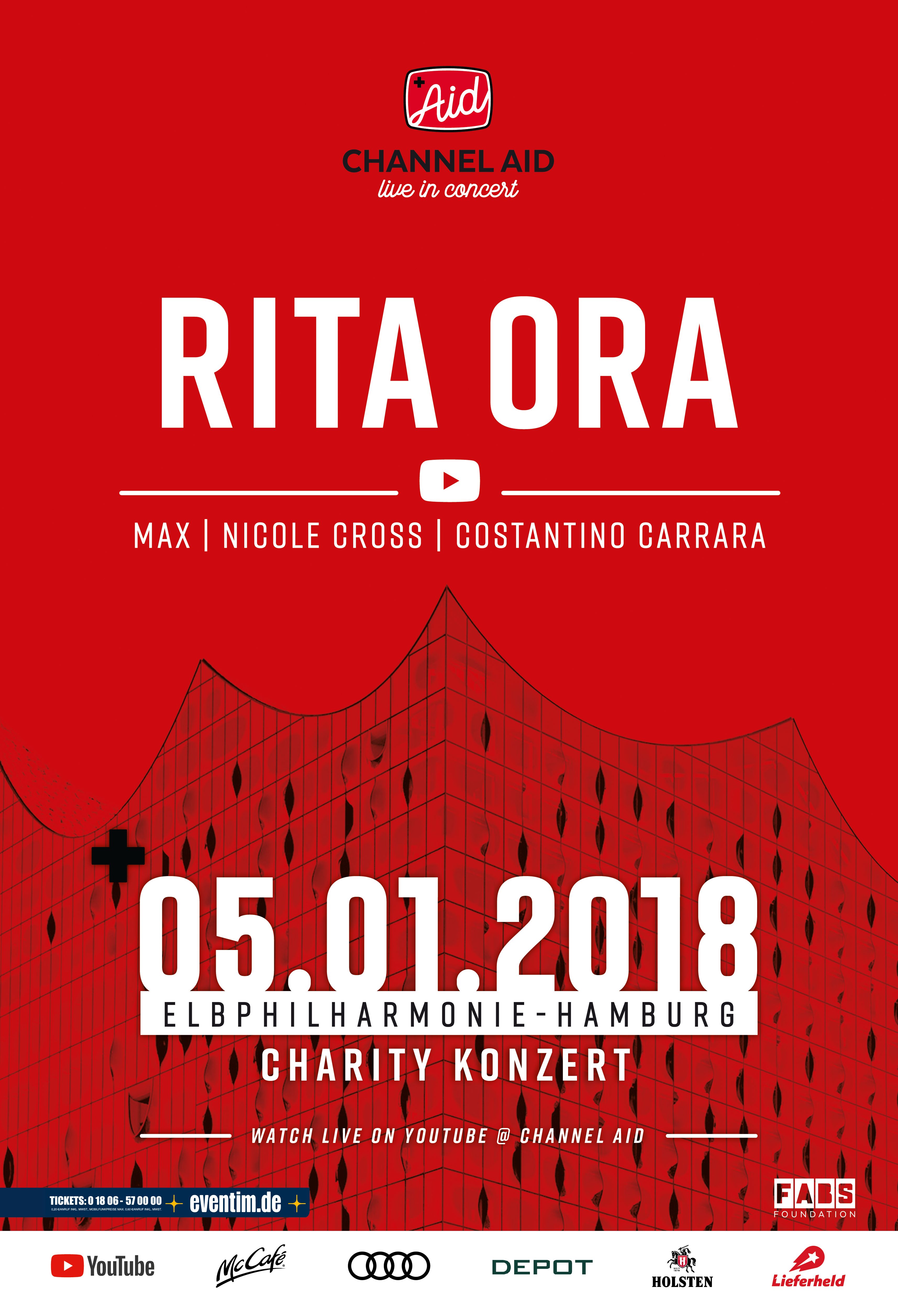 Die Hamburger FABS Foundation setzt ihre Aktion, bei der mit Hilfe von bekannten Internet-Influencern Spenden für soziale Projekte gesammelt werden, spektakulär fort. Zum Ende der "Season 1" des Channel Aid am 5. Januar 2018 wird die britische und international erfolgreiche Sängerin RITA ORA in der Elbphilharmonie Hamburg ein Konzert geben, das nicht nur von den Besuchern vor Ort, sondern auch live auf YouTube zu hören und zu sehen sein wird. Der Erlös sämtlicher Werbeeinnahmen auf dem ersten YouTube Charity-Kanal sowie alle Einnahmen aus dem Channel Aid live Konzert und der Aftershow-Party mit bekannten DJs kommen einem guten Zweck zugute.