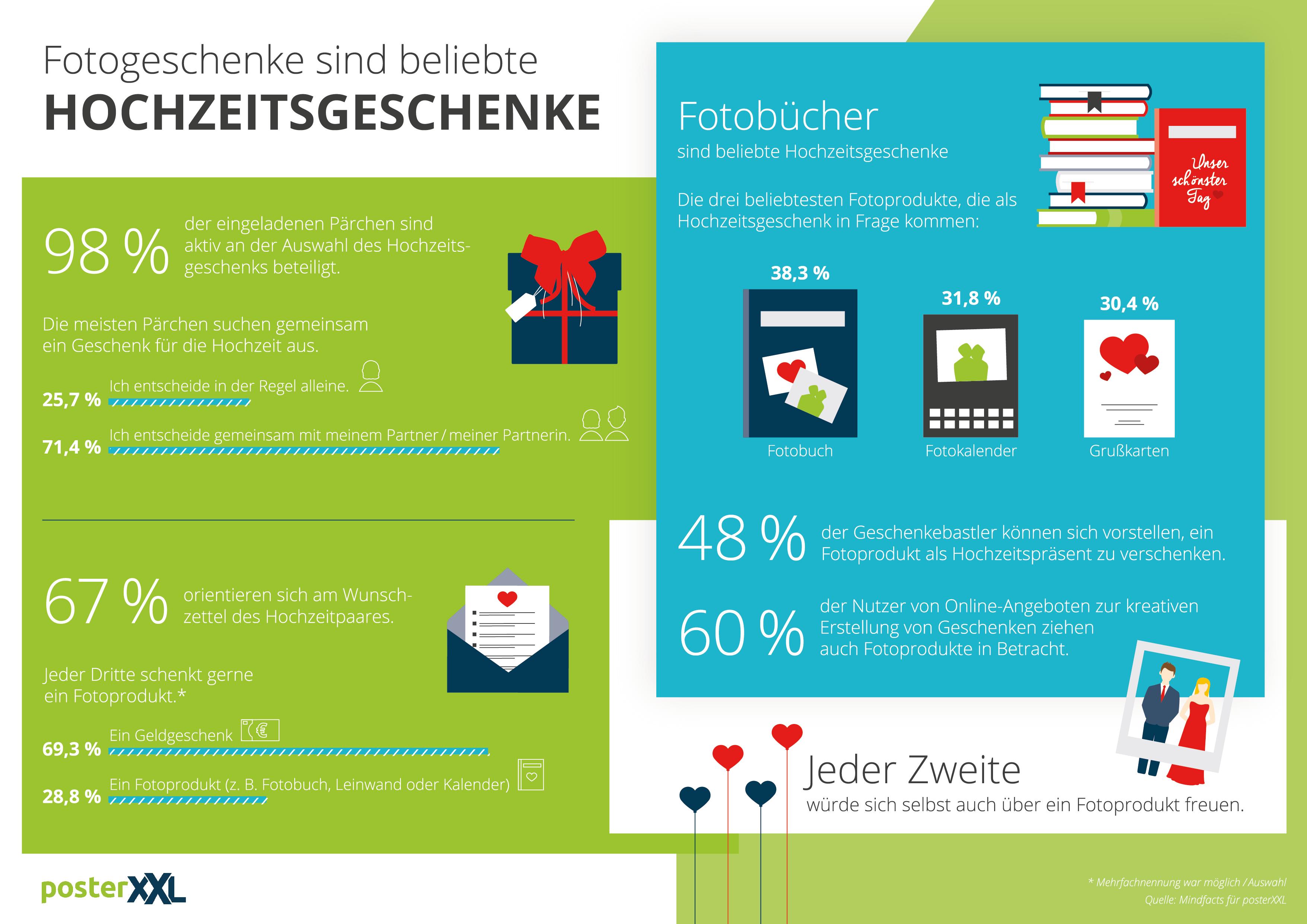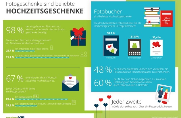 Einer der führenden Anbieter Deutschlands im Bereich Fotodienstleistungen und Digitaldruck, posterXXL, hat in Zusammenarbeit mit dem Marktforschungsunternehmen Mindfacts eine repräsentative Umfrage zum Thema Hochzeiten in Deutschland durchgeführt. 1.000 Personen haben sich zu ihrem Auswahlverhalten bei Hochzeitsgeschenken geäußert.