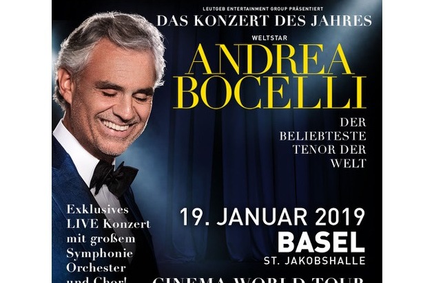 ANDREA BOCELLI´S exklusives Schweiz-Konzert im Rahmen seiner Welttournee am 19.1.2019 in Basel in der St. Jakobshalle, mit einer außergewöhnlichen LIVE-SHOW, großem Symphonieorchester, einem Chor der Extraklasse und zahlreichen, großartigen Gast-Künstlern, wird zu einem lebendigen Feuerwerk für alle Sinne.