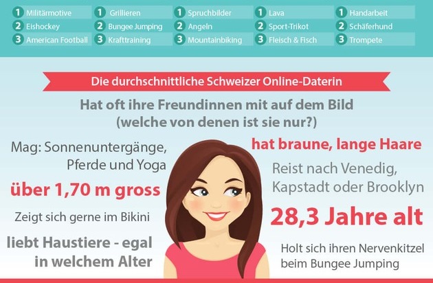 Welche Haarfarben sind zu sehen und welche Kleidung? Ist das Gesicht zu erkennen, lächeln die meisten Online-Dater oder schauen sie eher grimmig? Wer zeigt am meisten Haut? Was ist noch auf dem Bild zu sehen - Speisen, Getränke, Tiere oder gar eine Sehenswürdigkeit wie der Eiffelturm? Zeigen sich die Singles beim Sport, beim Feiern oder auch mal nur auf der Couch? Über 6'000 verschiedene Faktoren, darunter Erscheinungsmerkmale, Orte, Objekte aller Art und Grösse, Tiere, Anzahl der Personen, Gesichtsausdrücke und Farben wurden ausgewertet und in anschaulichen Diagrammen und Texten festgehalten. Aus den gewonnenen Erkenntnissen konnten die Experten von ZU-ZWEIT.ch auch praktische Tipps für die perfekte Profilbild-Auswahl ableiten, welche ebenfalls in der Studie enthalten sind.