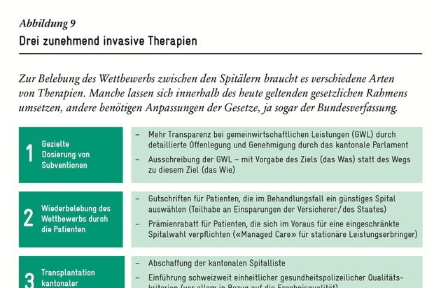 2. Aktiver Einbezug der Patienten: Patienten - also die Endkunden - sollen mitreden dürfen. Mit neuen Versicherungsmodellen, bei denen die Krankenkassen ihre Patienten vor Spitaleingriffen beraten, werden die Versicherten für Qualitäts- und Kostenunterschiede sensibilisiert. Wählen sie ein günstigeres, aber qualitativ gleichwertiges Angebot, werden sie für die resultierenden Kosteneinsparungen mit einer Gutschrift oder tieferen Prämien belohnt.