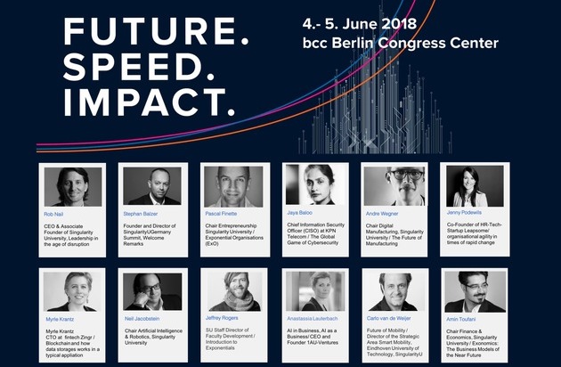 Am 4. und 5. Juni 2018 findet der 3. SingularityU Germany Summit in Berlin statt - die Leitkonferenz zu digitaler Transformation, künstlicher Intelligenz und exponentiellen Technologien. An zwei Tagen diskutieren namhafte Experten der Singularity University (SU) im Silicon Valley und Pioniere der internationalen High-Tech-Industrie mit Vertretern aus Wirtschaft, Politik und Medien über die Bedeutung und Potenziale disruptiver Technologien für die Gesellschaft.