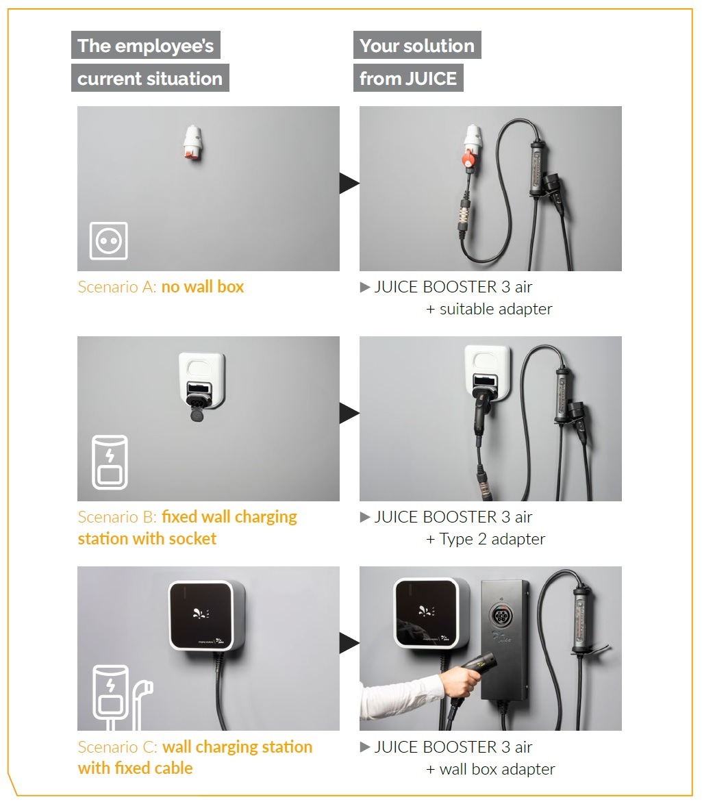 1. One solution for all scenarios: The JUICE BOOSTER 3 air covers all charging situations, whether socket or charging station with or without cable.