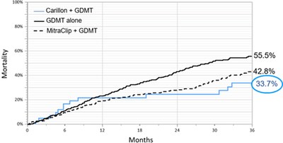 - Nach einem Jahr Nachbeobachtung konnte die NYHA-Klasse bei 64 % der Patienten herabgestuft werden, die Gehstrecke im 6-Minuten-Geh-Test nahm zu, und echokardiographische Messungen zeigten eine signifikante Abnahme des MR-Grades und ein günstiges Remodeling des linken Ventrikels. 2 - Die Überlebensrate nach Kaplan-Meier betrug 83,6 % nach 1 Jahr, 73,1 % nach 2 Jahren, 67,9 % nach 3 Jahren und 56,2 % nach 4 und 5 Jahren Nachbeobachtungszeit. 2 - Die primären Determinanten des Langzeitüberlebens waren eine Herabstufung in der NYHA-Klasse, eine Zunahme der Gehstrecke im 6-Minuten-Geh-Test und eine Abnahme des Regurgitationsvolumens während des ersten Jahres der Nachbeobachtung. 2 - Die Mortalitätsrate nach drei Jahren im Vergleich zu den publizierten Ergebnissen der COAPT-Studie und der medikamentösen Therapie gemäß Leitlinien (GDMT), unter Verwendung übereinstimmender Patientenpopulationen, betrug 33,7 % für Carillon, 42,8 % für MitraClip bei COAPT und 55,5 % bei GDMT - Abbildung 1. 2