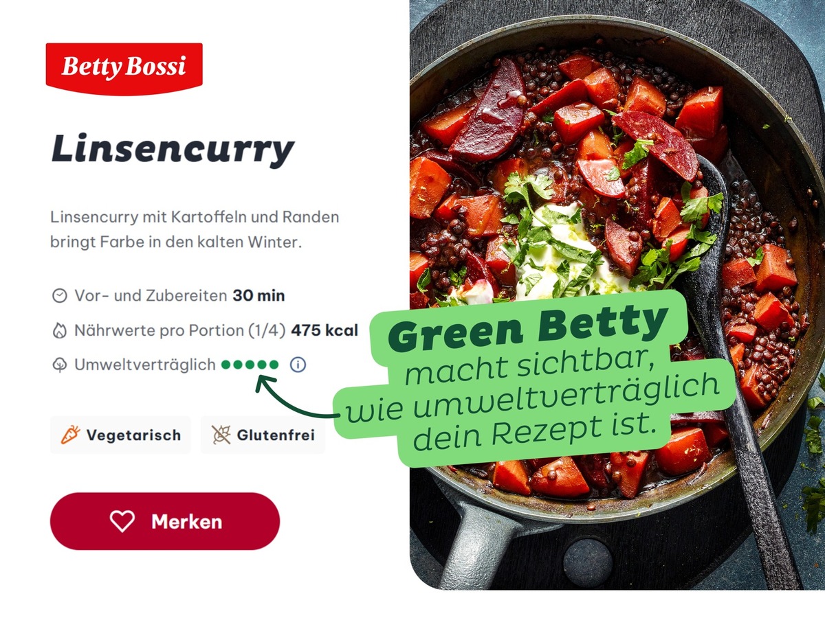 Betty Bossi lanciert als erstes Unternehmen in der Schweiz eine wissenschaftlich fundierte Skala für die Umweltverträglichkeit von Rezepten. Das innovative und transparente Bewertungsmodell wurde gemeinsam mit der ZHAW auf Basis des anerkannten Menü-Nachhaltigkeits-Index entwickelt. Für rund 3’000 Rezepte auf bettybossi.ch wurde die Gesamtumweltbelastung anhand der Ökobilanz automatisiert berechnet und mit einer Skala ausgezeichnet. Green Betty setzt damit einen neuen Standard in der Umweltdeklaration von Rezepten.