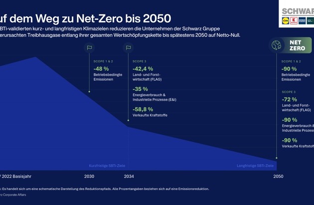 Als führendes Ökosystem - von der Produktion über den Handel bis hin zu Recycling und Digitalisierung - folgen die Unternehmen der Schwarz Gruppe auf ihrem Weg zu Net-Zero gemeinsam einer ganzheitlichen und spartenübergreifenden Klimastrategie mit ambitionierten, langfristigen Zielen gemäß der SBTi: Bis 2050 werden die betriebsbedingten Emissionen in Scope 1 und 2 um 90 Prozent gesenkt (Basisjahr 2019). In Scope 3 werden die land- und forstwirtschaftlichen Emissionen (FLAG) um 72 Prozent und die Emissionen im Bereich Energie und industrielle Prozesse (E&I) sowie die Emissionen aus verkauften Kraftstoffen um 90 Prozent bis 2050 reduziert (Basisjahr 2022). Die kurzfristigen Klimaziele bis 2030 bzw. 2034 wurden bereits im Frühjahr 2025 von der SBTi überprüft und validiert, die Validierung der langfristigen Ziele erfolgte dann im Herbst letzten Jahres.