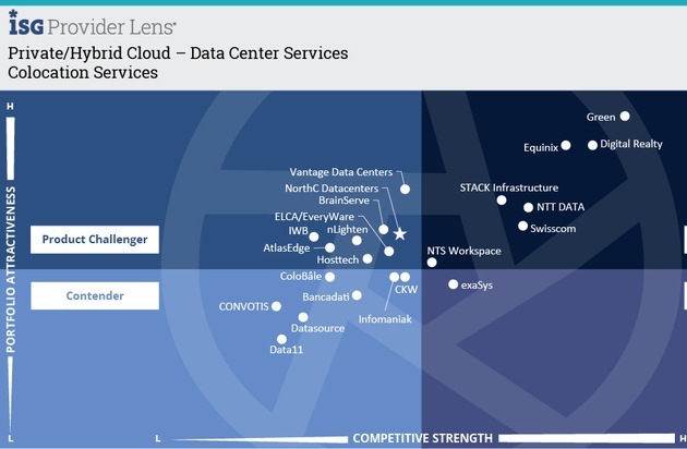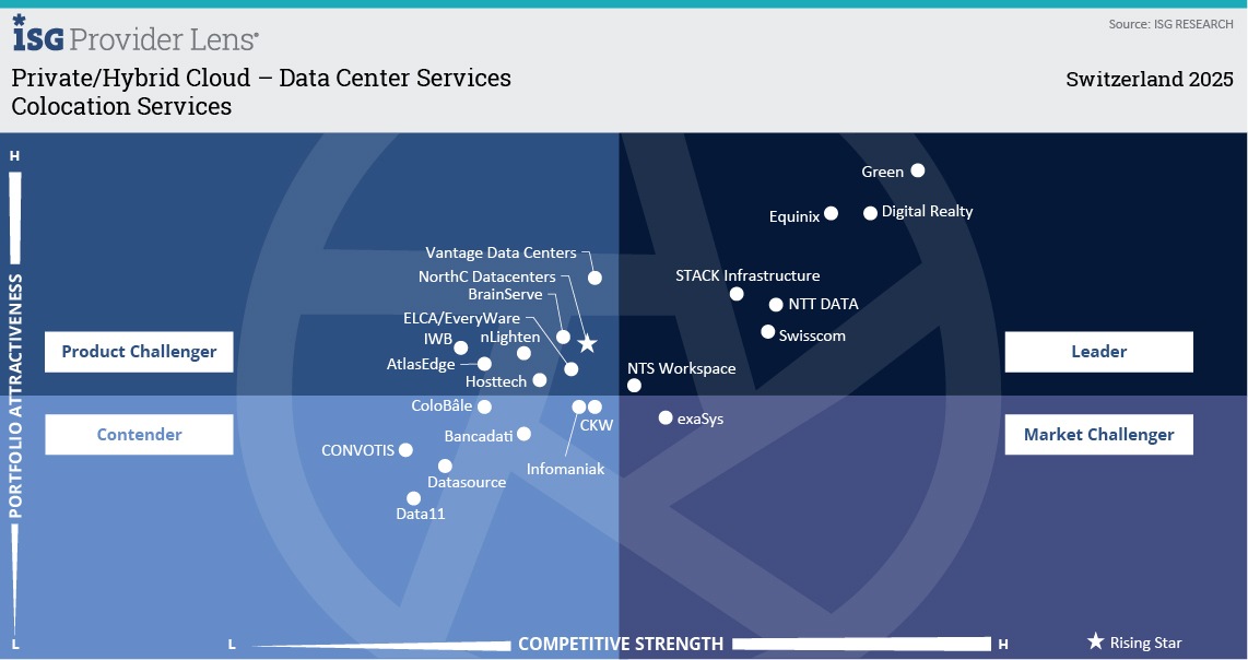 ISG, a global AI-centered technology research and advisory firm, examined the Swiss data center market in its independent study "Private/Hybrid Cloud – Data Center Services 2025," published today. All providers were evaluated in a multi-stage survey. Green has once again achieved a leader status and has been positioned at the forefront of both quadrant dimensions – competitive strength and portfolio attractiveness – for the sixth consecutive year.
