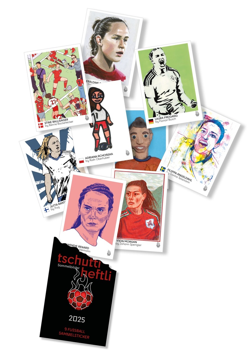Für das neue Album anlässlich der Frauen-EM 2025 haben 16 Künstler:innen aus der Schweiz, Deutschland, Österreich und Belgien je eine teilnehmende Nationalmannschaft illustriert – jede:r mit eigener künstlerischer Handschrift. Die Porträts wurden in unterschiedlichsten Techniken gestaltet: von Acrylmalerei über gestrickte Gesichter und Bügelperlen-Designs bis hin zu gesprayter Street Art im Stencil-Stil. Die Spielerinnen erscheinen als Wimmelbild, als Superheldinnen oder im Stil klassischer Sportgrafik – und machen das Heftli zu einem einzigartigen Kunstprojekt mit Sammeleffekt!