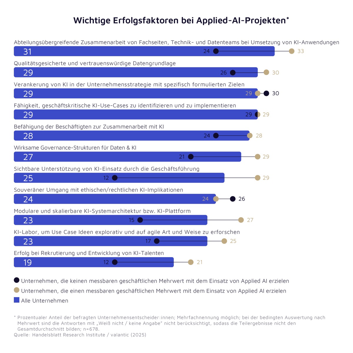 Während die Top 5 der Erfolgsfaktoren jeweils von rund einem Drittel der Befragten als besonders wichtig für das eigene Unternehmen benannt werden, hält nur knapp jeder Fünfte die Gewinnung von KI-Talenten für erfolgskritisch. Dies könnte einerseits darauf zurückzuführen sein, dass die am Markt verfügbaren KI-Modelle inzwischen einen höheren Reifegrad haben und deutlich leichter von Unternehmen in ihre spezifischen Prozesse integriert werden können. Andererseits ist das KI-spezifische Know-how bei IT-Absolvent:innen inzwischen allgemein höher ausgeprägt als noch vor ein paar Jahren, so dass personalseitig weniger Spezialistentum aufgebaut werden muss. Stattdessen liegt der Fokus stärker auf der Entwicklung von KI-Kompetenz in der Breite der Belegschaft.