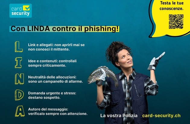 Oggi prende avvio la campagna nazionale per una maggiore sicurezza delle carte di pagamento lanciata da Card Security in collaborazione con la polizia. Motto della campagna: "LINDA lo sgama!". La pescatrice LINDA aiuta i titolari di carte di pagamento a proteggersi dalle frodi. Ogni lettera del nome LINDA è sinonimo di una frase promemoria che aiuta a impedire il phishing. Le società emittenti carte di pagamento e le banche di tutta la Svizzera sostengono la campagna e, insieme alla polizia, rendono attenti sul tema delle frodi con carte di pagamento: infatti, gli attacchi di phishing sono in rapido aumento.