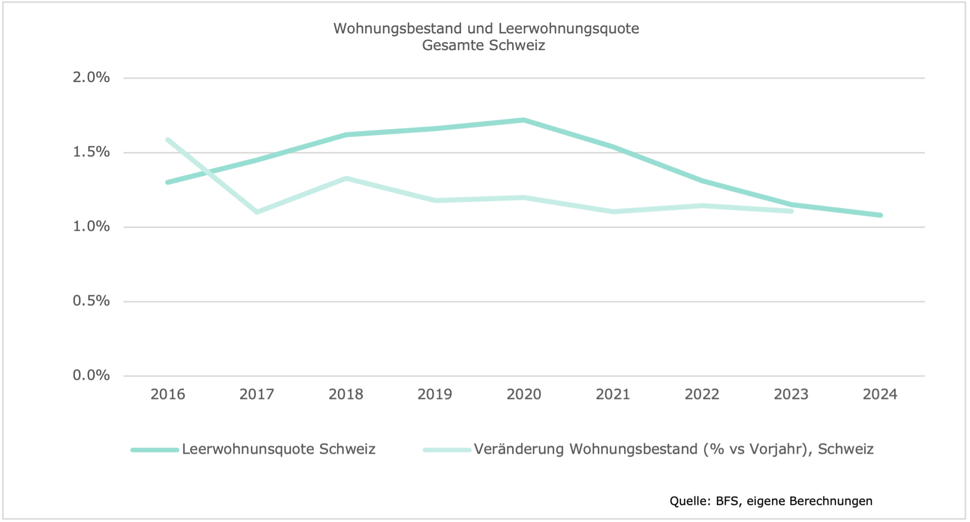 Die untenstehende Grafik zeigt, dass die Leerwohnungsquote in der Schweiz seit ihrem Höchststand 2020 (1.72 %) kontinuierlich zurückgegangen ist und 2024 nur noch 1.08 % beträgt. Damit ist der Anteil leerstehender Wohnungen innerhalb weniger Jahre auf ein Rekordtief gefallen. Gleichzeitig blieb das Wachstum des Wohnungsbestands mit rund 1.1 % pro Jahr weitgehend stabil. Das bedeutet: Der Rückgang der Leerstände ist weniger auf eine sinkende Neubautätigkeit zurückzuführen, sondern stärker auf eine anhaltend hohe Nachfrage nach Wohnraum.