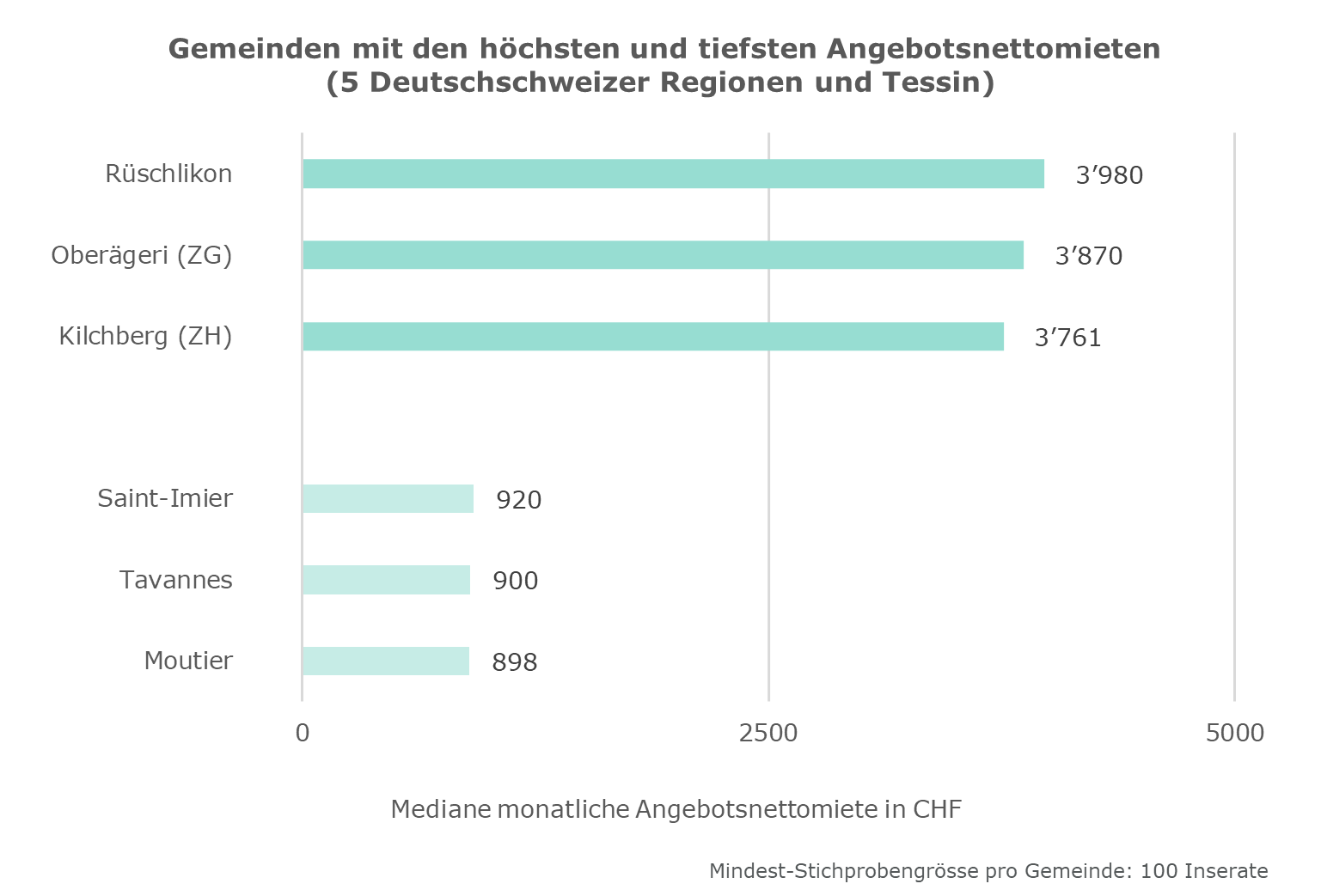 In der nachfolgenden Graphik wird die Spreizung nach Gemeinden am Schweizer Mietwohnungsmarkt aufgezeigt. Sie stellt die Gemeinden mit den höchsten Nettoangebotsmieten denjenigen mit den tiefsten Nettoangebotsmieten gegenüber.