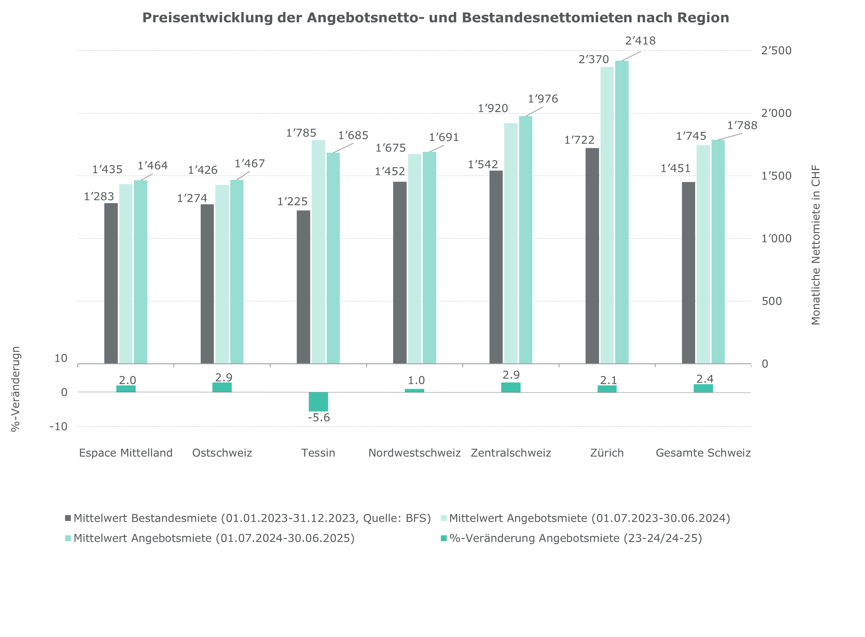 Zürich bleibt die teuerste Region; die Ostschweiz und Zentralschweiz verzeichnen den stärksten Mietanstieg