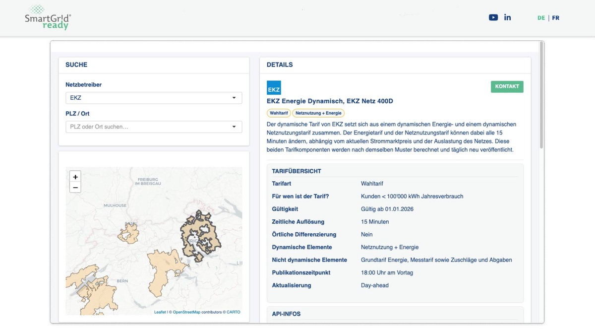 Die Karte verfügt über eine Suchfunktion, um schnell herauszufinden, ob im betreffenden Gebiet bereits dynamische Tarife existieren. Direkt in der Karte sind sämtliche Informationen zu den Tarifen hinterlegt. Zusätzlich finden sich alle wichtigen Dokumente, Links und technischen Informationen für die Integration in EMS-Systeme. Das Gebäudelabel von SmartGridready garantiert zudem, dass die Systeme optimal von den dynamischen Tarifen profitieren können.