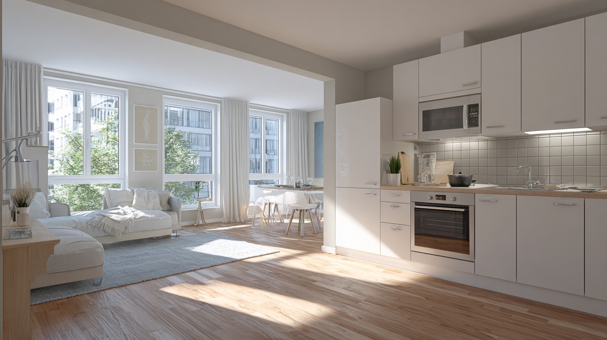 Die Küche ist oft offen und kompakt, geprägt von weissen Schränken und Fronten mit flachen Paneelen. Im Badezimmer zeigen sich Standardfeatures wie Dusche, Toilette, Waschbecken und Spiegel, ergänzt durch Wand- und Bodenplatten in neutralem Design.