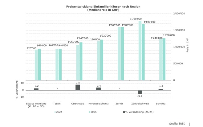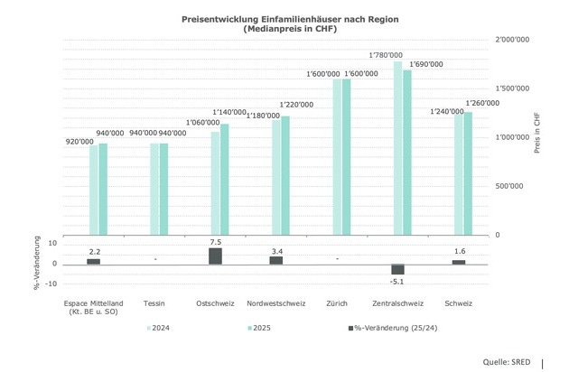 In den übrigen Regionen, deren Medianpreise alle deutlich unter der Millionengrenze liegen, zeigten 2025 ein deutlich verhalteneres Bild. In der Nordwestschweiz gingen die Preise um 2.3 % zurück und liegen nun bei CHF 0.86 Mio. pro Objekt. Auch im Espace Mittelland (–2.9 %) sowie im Tessin (–3.0 %) kam es zu Preiskorrekturen. Dort bewegen sich die mediane Preise mit CHF 0.68 Mio. beziehungsweise CHF 0.64 Mio. weiterhin deutlich unter der Millionengrenze. In der Ostschweiz blieben die Preise stabil bei CHF 0.82 Mio.