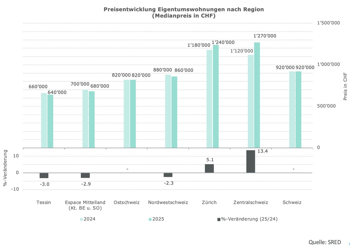 Die höchsten Preise für Eigentumswohnungen finden sich 2025 neu in der Zentralschweiz. Mit einem mittleren Objektpreis von CHF 1.27 Mio. überholte die Region erstmals die Region Zürich, wo EGTWs im Median CHF 1.24 Mio. kosten. Ausschlaggebend dafür war das starke Preiswachstum von 13.4 % in der Zentralschweiz, während die Preise in der Region Zürich um 5.1 % zulegten. Unter anderem die besseren fiskalischen Rahmenbedingungen haben dazu beigetragen, dass die Anzahl Beschäftigter in den letzten Jahren in der Region Zentralschweiz stärker gestiegen ist als in der Region Zürich. Dies dürfte erklären, weshalb die Region Zentralschweiz auf Platz 1 vorgerückt ist.