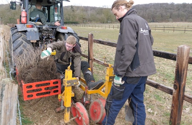 Mit Spaten stechen die jungen Helfer in Arbeitsmontur kleine Löcher in einen Streifen knapp vor einer Pferdekoppel. An einer breiteren Stelle wird das später von einer Maschine übernommen, die von einem kleinen Traktor gezogen wird. "Wir bereiten hier das Pflanzen einer Hecke vor", erklärt Malve Falk. Diese können dann schon bald einen wichtigen Beitrag zum Erhalt und Förderung von Biodiversität leisten. "Vögel nisten darin und eine Vielzahl an Insekten und Tieren finden Schutz und Unterschlupf", ergänzt Malve Falk.