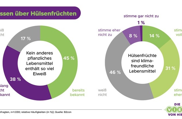 Weniger als die Hälfte der Befragten wusste, dass keine andere pflanzliche Lebensmittelgruppe so viel Eiweiß liefert wie Hülsenfrüchte. 38 Prozent gaben an, diese Eigenschaft sei ihnen bislang nicht bekannt gewesen. Auch die positiven Klima- und Umwelteigenschaften werden noch zu wenig wahrgenommen. Nur etwa 45 Prozent stimmten zu, dass Hülsenfrüchte klimafreundliche Lebensmittel sind, immerhin mehr als die Hälfte (52 Prozent) sehen sie als umweltfreundlich an.