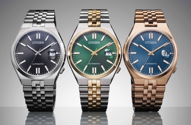 CITIZEN präsentiert die neuen TSUYOSA-Modelle mit 60 Stunden Gangreserve, strukturiertem Zifferblatt und Multi-Link-Band in drei Varianten: In Edelstahl mit schwarzem Zifferblatt, in Bi-Color mit grünem Zifferblatt und in einer rosé-goldenen Variante. Sie sind ab September im Fachhandel und auf citizenwatch.eu erhältlich. Die unverbindliche Preisempfehlung liegt bei 379 Euro (Edelstahl), 399 Euro (Bi-Color) und 429 Euro (Roségolden, IP-Beschichtung).