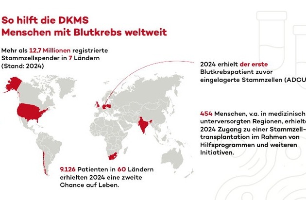 9.126 Menschen in 60 Ländern erhielten im Jahr 2024 eine zweite Lebenschance durch Transplantation einer DKMS-Stammzellspende, in Deutschland waren es 6.627. Bis einschließlich 2024 ermöglichte die DKMS im Rahmen von Hilfsprogrammen und weiteren Initiativen zusätzlich 2.275 Menschen, vor allem in medizinisch unterversorgten Regionen, Zugang zu lebensrettenden Transplantationen, davon 454 im Jahr 2024.