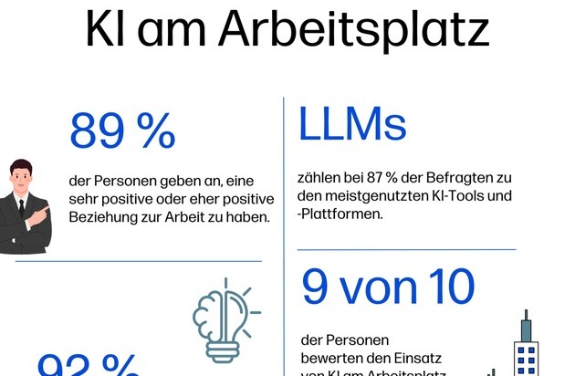 Über 90 Prozent der Befragten bewerten den Einsatz von KI am Arbeitsplatz als positiv. 85 Prozent fühlen sich gut über das Thema informiert und 61 Prozent nutzen KI bereits regelmässig. Besonders beliebt bei den Befragten ist die Nutzung von Large-Language-Modellen, wie z.B. ChatGPT (87 %) oder Sprach- und Übersetzungsmodellen, wie z.B. DeepL oder Grammarly (63 %). KI kommt am häufigsten bei Recherchearbeiten / Informationsbeschaffung (60 %), im Marketing (Text-, Bild-/Videoerstellung) (53 %) sowie in der Datenanalyse / Reporting (50 %) zum Einsatz.
