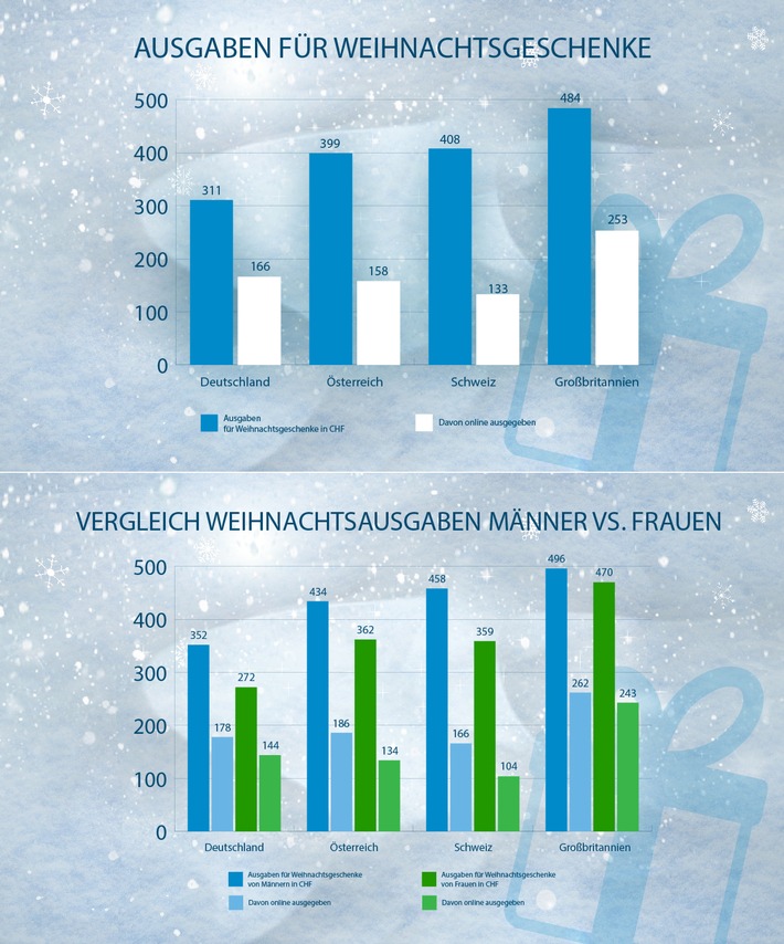 In der Schweiz will knapp die Hälfte der Befragten (46,5 %) mehr als 300 Franken ausgeben, 17,6 % sogar über 500 Franken. 6,1 % hingegen geben keinen Rappen für Weihnachtsgeschenke aus. 17 % der Schweizer Studienteilnehmer wollen bis 100 Franken, 21,4 % bis 200 Franken und weitere 15,1 % bis 300 Franken für ihre Geschenke aufwenden. Die Ausgaben variieren stark nach Altersgruppe: Wenig überraschend steigen sie in der Schweiz von 173 Franken bei den 16- bis 19-Jährigen bis auf 499 Franken bei den 60- bis 69-Jährigen. Der genau gegenläufige Trend zeigt sich in Grossbritannien, wo - abgesehen von den Jüngsten - die Ausgaben mit zunehmendem Alter markant sinken. Das könnte seine Ursache in der stark nachlassenden Kaufkraft älterer Menschen aufgrund einer schwächeren sozialen Absicherung auf der Insel haben.