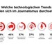 Fragt man nach den neuen technologischen Trends im Journalismus, so sind es Livestreaming (67 Prozent), VR/AR (49 Prozent) und Messenger-Dienste (45 Prozent), die sich nach Meinung der Befragten am ehesten im Medienmarkt etablieren werden. An einen langfristigen Erfolg von Podcasts glauben nur 27 Prozent. Was in Sachen Medieninnovationen zuversichtlich macht: Nur jeder Zehnte glaubt, dass sich keines der genannten Formate durchsetzen wird. (Siehe Grafik: "Technologische Trends").