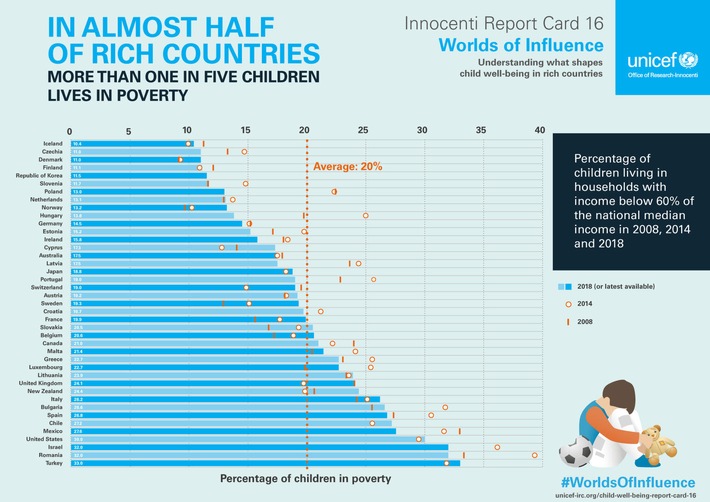 Für den Report "Worlds of Influence: Understanding what shapes child well-being in rich countries" ("Einflusssphären - was das Wohlergehen von Kindern in reichen Ländern prägt") wurden vergleichbare nationale Daten aus 41 Ländern der OECD und der Europäischen Union zur psychischen und physischen Gesundheit von Kindern sowie zu ihren schulischen und sozialen Kompetenzen und den damit verbundenen gesellschaftlichen Rahmenbedingungen ausgewertet.