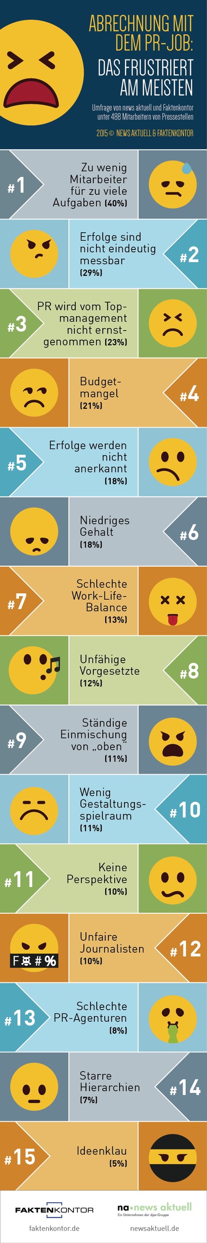 MedienmitteilungWas am PR-Job frustriert: Zu wenig Mitarbeiter für zu viele Aufgaben2015-05-05T10:35:27Hamburg (ots) - - Querverweis: Dokumente liegen in der digitalen Pressemappe zum Download vor und sind unter http://www.presseportal.de/meldung/3013634 abrufbar - - Querverweis: Bildmaterial wird über obs versandt und ist abrufbar unter http://www.presseportal.de/meldung/3013634 - Wie soll ich das bloß alles schaffen? In der vorgegebenen Zeit und mit den vorhandenen Ressourcen? Zu viele Aufgaben für zu wenig Mitarbeiter: Das ist mit Abstand der größte Frust-Faktor in deutschen Pressestellen. Die dpa-Tochter news aktuell und Faktenkontor veranschaulichen in einer neuen Infografik die häufigsten Ursachen für Unzufriedenheit im PR-Job. Mehr als 480 Mitarbeiterinnen und Mitarbeiter von Pressestellen haben an der Umfrage teilgenommen. Demnach geben 40 Prozent der Befragten an, dass sie die Fülle der Aufgaben nicht mehr zufriedenstellend bewältigen können. Auf Platz zwei: Fast ein Drittel (29 Prozent) ist davon frustriert, dass sich ihre Erfolge nicht eindeutig messen lassen. Auch mangelnde Wertschätzung der Arbeit sorgt für Unzufriedenheit im PR-Alltag. So beklagt knapp ein Viertel der Befragten (23 Prozent), dass PR vom Topmanagement nicht ernstgenommen wird (Platz drei). Knapp darauf folgt die Aussage, dass das Budget nicht reicht (21 Prozent). Für vergleichsweise wenig Unmut sorgt hingegen das Gehalt. Nur knapp jeder Fünfte (18 Prozent) fühlt sich schlecht bezahlt. Noch positiver fällt die Beurteilung der persönlichen Weiterentwicklung am Arbeitsplatz aus. Hier sehen nur zehn Prozent der PR-Mitarbeiter keine Perspektive in ihrem Unternehmen und nur sieben Prozent bemängeln die starren Hierarchien. Die Umfrageergebnisse im Detail: 1. Zu wenig Mitarbeiter für zu viele Aufgaben (40 Prozent) 2. Erfolge sind nicht eindeutig messbar (29 Prozent) 3. PR wird vom Top-Management nicht ernstgenommen (23 Prozent) 4. Budgetmangel (21 Prozent) 5. Erfolge werden nicht anerkannt (18 Prozent) 6. Niedriges Gehalt (18 Prozent) 7. Schlechte Work-Life-Balance (13 Prozent) 8. Unfähige Vorgesetzte (12 Prozent) 9. Ständige Einmischung von "oben" (11 Prozent) 10. Wenig Gestaltungsspielraum (11 Prozent) 11. Keine Perspektive (10 Prozent) 12. Unfaire Journalisten (10 Prozent) 13. Schlechte PR-Agenturen (8 Prozent) 14. Starre Hierarchien (7 Prozent) 15. Ideenklau (5 Prozent) Quelle: Social Media Trendmonitor 2015 Der Social Media Trendmonitor ist eine Online-Befragung, die von der dpa-Tochter news aktuell und Faktenkontor gemeinsam durchgeführt wird. Die beiden Unternehmen untersuchen regelmäßig die aktuellen Tendenzen und Entwicklungen in der Kommunikationsbranche. Datenbasis: 488 Mitarbeiterinnen und Mitarbeiter von Pressestellen Methode: Online-Befragung, Mehrfachnennungen möglich. Befragungszeitraum: 1. Quartal 2015 Initiatoren der Umfrage: www.newsaktuell.de www.faktenkontor.de Kontakt: news aktuell GmbH Permalink: