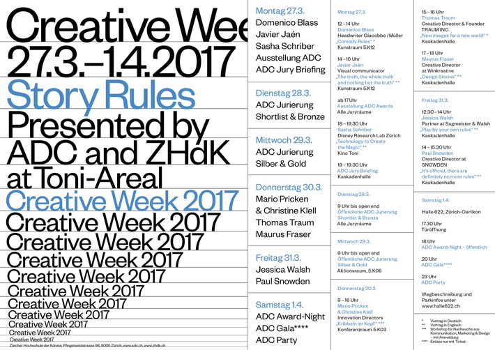 MedienmitteilungCreative Week presented by ADC & ZHDK, ADC Jurierung, Award-Night & Gala, 27.3. - 1.4.20172017-03-10T15:12:52Zürich (ots) - Der ADC Switzerland führt mit und in der Zürcher Hochschule der Künste (ZHdK) vom 27. März bis zum 1. April die Creative Week durch. Hochkarätige nationale und internationale Referenten wie Jessica Walsh, Mario Pricken, Paul Snowden, Domenico Blass oder Javier Jaén sprechen zu Themen rund um das diesjährige Motto "Story rules". Gleichzeitig findet die ADC Jurierung der eingereichten Arbeiten öffentlich statt. Referate und Workshops zum Thema "Story rules" An den hochkarätig besetzten Referaten und Workshops geben unter anderem die New Yorker Designerin und Art Direktorin Jessica Walsh (Sagmeister & Walsh), der langjährige "Giaccobo/Müller"-Headwriter Domenico Blass, der Autor Mario Pricken (u.a. "Kribbeln im Kopf"), Aktionskünstler Paul Snowden oder Illustrator Javier Jaén aus Barcelona einen Einblick in die Bedeutung einer guten Story. Und verraten dabei ihre eigenen "Story rules": Kleine Regeln, die sie oder er nutzt, um gute Geschichten zu finden und zu entwickeln. Die Referate und Workshops sind kostenlos. Zürcher Hochschule der Künste - Toni Areal: Austragungsort und kreativer Partner Die zum zweiten Mal in enger Kooperation mit dem Design Departement der Zürcher Hochschule der Künste (ZHdK) organisierte Creative Week findet vom 27. März bis 1. April im Toni-Areal in Zürich statt. Die ZHdK als wahrscheinlich europaweit einzigartige Bildungsstätte, an der sich die verschiedenen Ausrichtungen des Designs und der Künste unter einem Dach zusammenfinden, bietet dazu die inspirierende räumliche Plattform. So zeichnen sich fünf Bachelor Studierende der Vertiefung "Visuelle Kommunikation" unter der Leitung von Jonas Voegeli für den Design Auftritt der Creative Week verantwortlich. Kreativen Social Media-Content rund um die Creative Week erstellt die Fachrichtung "Cast/Audiovisuelle Medien", geleitet von Martin Zimper, in einem eigens dafür angebotenen Modul. Öffentliche ADC Jurierung 28. und 29. März Abermals findet die ADC Jurierung am Dienstag (Shortlist & Bronze) und Mittwoch (Silber & Gold) öffentlich statt und gibt damit dem breiten Publikum einen umfassenden Einblick in das Schaffen und in die Bewertungskriterien der führenden Kreativen der Kommunikationsbranche. In den 9 Jurygruppen werden die jährlich mehr als 600 Einreichungen in 18 Kategorien bewertet. Die Jury setzt sich aus Mitgliedern des ADC Switzerland, geladenen Fachjuroren aus PR, Fotografie und dem Digitalbereich sowie zwei prominenten Gastjuroren zusammen. ADC Award-Night & ADC Gala in neuer Location Glänzender Abschluss ist die öffentliche ADC Award-Night am Samstag, 1. April um 18 Uhr in der Halle 622 in Zürich-Oerlikon. Im Anschluss wird an der ADC Gala mit über 600 Gästen gefeiert. Tickets können ab sofort unter www.adc.ch/store gekauft werden. Wir freuen uns, Sie an der Creative Week 2017 zu begrüssen und stehen Ihnen bei Fragen gerne zur Verfügung. Damit wir Ihren persönlichen Medienausweis für die ADC Award-Night & Gala bereitlegen können, bitten wir Sie um eine Akkreditierung. Kreative Grüsse ADC Switzerland #ADCCreativeWeek I #ADCAward I #ADCGala I #ADCAwardNight @ADCSwitzerland Kontakt: Ingrid Notter Permalink: