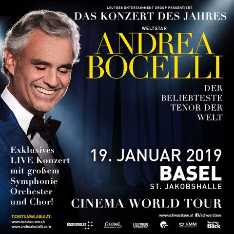 MedienmitteilungANDREA BOCELLI am 19.1.2019 in der St. Jakobshalle in BASEL - BILD2017-09-08T09:01:49Time To Say Hello - Andrea Bocelli kommt am 19.1.2019 mit einer unvergesslichen LIVE SHOW nach BASEL in die St. Jakobshalle Graz (ots) - ANDREA BOCELLI´S exklusives Schweiz-Konzert im Rahmen seiner Welttournee am 19.1.2019 in Basel in der St. Jakobshalle, mit einer außergewöhnlichen LIVE-SHOW, großem Symphonieorchester, einem Chor der Extraklasse und zahlreichen, großartigen Gast-Künstlern, wird zu einem lebendigen Feuerwerk für alle Sinne. Der mit den World Music Awards als weltbester Klassik-Künstler ausgezeichnete italienische Ausnahmetenor Andrea Bocelli kommt 2019 mit einer unübertroffenen LIVE-SHOW zurück in die Schweiz. Bocelli gilt als einer der meist gefragten klassischen Sänger auf dem Tonträgermarkt und mit mehr als 80 Millionen verkauften Alben weltweit ist Andrea Bocelli der erfolgreichste klassische Solokünstler aller Zeiten. Himmlischer Musikgenuss: Andrea Bocelli, die Stimme Gottes, berührt die Menschen auf eine einzigartig wundervolle Art und Weise und Sie dürfen sich bereits jetzt schon auf einen grandiosen, aufregenden Konzertabend freuen! Berühmten Werken wird mit Unterstützung eines herausragenden Orchesters, eines Chores, sowie weiterer Solisten eine neue Klangdimension vermittelt. Insgesamt sorgen über 150 begnadete Musiker für ein Konzerterlebnis der besonderen Art, das den Besuchern Gänsehaut-Feeling pur bescheren wird. Seien Sie beim Konzert des Jahres am 19.1.2019 in Basel LIVE mit dabei und lassen Sie sich dieses einmalige und phantastische Musikereignis nicht entgehen. Sichern Sie sich jetzt Ihre Tickets in der von Ihnen gewünschten Kategorie unter [http://www.ticketcorner.ch] (http://www.ticketcorner.ch/) und allen Ticket Corner -Vorverkaufsstellen Weitere Infos finden Sie auf: [www.schwarzlsee.at] (http://www.schwarzlsee.at/) und [www.facebook.com/schwarzlsee] (http://www.facebook.com/schwarzlsee). Video: [https://youtu.be/C7QRcMgODpc] (https://youtu.be/C7QRcMgODpc) Tickets unter: [https://www.ots.at/redirect/ticketcorner] (https://www.ots.at/redirect/ticketcorner) Rückfragehinweis: Global Event & Entertainment GmbH Salztorgasse 2/8 1010 Wien Österreich E-Mail: presse@schwarzlsee.at Verwaltung: Thalerhofstraße 85 8141 Premstätten Österreich Permalink:
