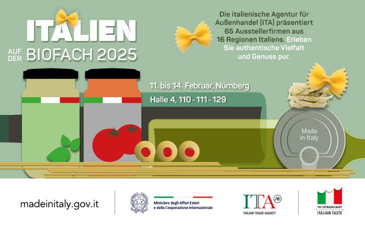 MedienmitteilungVielfalt und Genuss aus Italien auf der BIOFACH 2025: Auf dem Gemeinschaftsstand der Italian Trade Agency präsentieren 65 Produzenten aus 16 Regionen ihre kulinarischen Highlights2025-02-10T15:25:39Berlin/Nürnberg (ots) - Auch in diesem Jahr ist die Italian Trade Agency (ITA) mit einem Gemeinschaftsstand auf der BIOFACH vertreten. Hier werden in diesem Jahr 65 Produktionsbetriebe aus fast ganz Italien zeigen, was sie an Neuheiten zu bieten haben. Das Spektrum der teilnehmenden Firmen reicht vom etablierten Traditionsunternehmen bis hin zum Newcomer auf internationalem Parkett. Ihr Angebot umfasst erlesene Olivenöle und Essigspezialitäten, frische und getrocknete Pasta, Backwaren, süße und salzige Snacks, Saucen und Pesto, Brotaufstriche, Kaffee, Limonaden, Säfte, Weine, Trüffel, eingelegtes oder eingemachtes Obst und Gemüse und vieles mehr - vom Manufaktur-Erzeugnis bis hin zu neuen glutenfreien Produkten und fertigen Risotto-Mischungen. Viele der präsentierten Produkte sind mit einem der beiden EU-Gütesiegel "geschützte Ursprungsbezeichnung" (g.U.) oder "geschützte geografische Angabe" (g.g.A.) ausgezeichnet. In diesem Jahr kommen die Aussteller auf dem ITA-Gemeinschaftsstand aus 16 von insgesamt 20 italienischen Regionen, und zwar aus: Abruzzen, Apulien, Emilia-Romagna, Kalabrien, Kampanien, Latium, Ligurien, Lombardei, Marken, Molise, Piemont, Sizilien, Toskana, Trentino-Südtirol, Umbrien und Venetien. Das breit gefächerte Sortiment an Bioprodukten "made in Italy" lässt kaum Wünsche offen. Die Italian Trade Agency lädt Interessierte herzlich ein, sich auf dem italienischen Gemeinschaftsstand vom vielfältigen Angebot inspirieren zu lassen. Gemeinschaftsstand der Italian Trade Agency auf der BIOFACH 2025, Messe Nürnberg, Halle 4, Stände 110 - 111- 129. Italien ist führend, wenn es um Produkte aus biologischem Anbau geht. Der "Stiefel" zählt zu den weltweit größten Herstellern von Bioprodukten. Der Absatz im In- und Ausland wächst seit Jahren kontinuierlich. Mit einem Exportvolumen im Wert von geschätzten 3,6 Milliarden Euro im Jahr 2023 belegt Italien aktuell Platz 1 im Ranking der europäischen Exportländer und Platz 2 im weltweiten Vergleich. Detailinformationen zu den 65 Ausstellern auf dem italienischen Gemeinschaftsstand gibt es hier. Über die Italian Trade Agency: Die Italian Trade Agency ITA hat als staatliche Agentur für Außenhandel die Aufgabe, die Wirtschafts- und Handelsbeziehungen zwischen Italien und Deutschland zu fördern und die italienischen Hersteller bei der Vermarktung u. a. von Genussprodukten "made in Italy" zu unterstützen. Kontakt: ITA - Italienische Agentur für Außenhandel - Permalink: