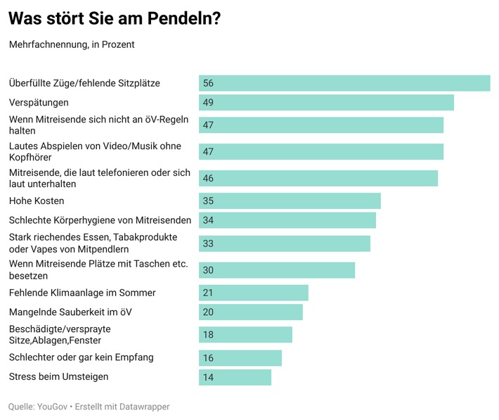 MedienmitteilungDas Auto ist am beliebtesten: So pendelt die Schweiz2024-11-11T11:29:16MEDIENMITTEILUNG Das Auto ist am beliebtesten: So pendelt die Schweiz Zürich, 05. November 2024 – Wie pendelt die Schweiz? Dies wollte YouGov im Auftrag der Immobilienplattform newhome in einer repräsentativen Umfrage herausfinden. Rund die Hälfte legt den Arbeitsweg mit dem Auto zurück, im öffentlichen Verkehr nerven volle Züge sowie laute Mitreisende. Ein Umzug, um den Arbeitsweg zu verkürzen, ist für die meisten keine Option. Knapp 80 Prozent der Schweizer Berufstätigen legen ihren Arbeitsweg an mindestens drei Tagen pro Woche zurück, davon pendeln 43 Prozent sogar an fünf oder mehr Tagen. Im Durchschnitt sind sie rund eine Stunde pro Tag unterwegs. Dabei legt der Grossteil der Befragten (45 Prozent) den Arbeitsweg in weniger als 20 Minuten zurück, während nur sechs Prozent pro Weg länger als eine Stunde benötigen. Wer häufig pendelt, hat tendenziell auch einen kürzeren Arbeitsweg. Doch wie legt man den Arbeitsweg zurück, womit beschäftigt man sich unterwegs und was stört an der Pendelei? YouGov hat im Auftrag von newhome eine repräsentative Umfrage dazu durchgeführt. * Das Auto bleibt erste Wahl Fast die Hälfte (46 Prozent) der Befragten legt den Arbeitsweg mit dem Auto zurück, etwas mehr als ein Drittel setzt auf öffentliche Verkehrsmittel und gut ein Fünftel nimmt das Velo. Die Befragten unter 29 Jahren sind gemäss Umfrage vermehrt in den Fahrzeugen des öffentlichen Verkehrs anzutreffen (51 Prozent), während nur 27 Prozent der über 45-Jährigen mit dem öV zur Arbeit fahren. Umziehen will fast niemand Da lange Arbeitswege zur Belastung werden können, steht auch die Frage nach einem Umzug im Raum: Ab welcher Reisezeit würden Befragte ihren Wohnort verändern, um den Arbeitsweg zu verkürzen? Die Antwort fällt recht eindeutig aus: Fast gar nicht. 41 Prozent würden eher die Stelle wechseln und 15 Prozent würden auf mehr Homeoffice setzen. Bei sieben Prozent liegt die Schmerzgrenze bei einer Stunde. Besonders Frauen und Befragte über 60 sowie Hauseigentümer und Familien mit schulpflichtigen Kindern geben an, für einen kürzeren Arbeitsweg keinen Umzug in Betracht zu ziehen. Pendeln ist weniger nervig als vermutet Wie sehr setzt den Menschen in der Schweiz Pendeln zu? 35 Prozent empfinden es als eher bis sehr entspannt, für 23 Prozent ist der Arbeitsweg eher bis sehr nervig. 35 Prozent stehen ihrem Arbeitsweg recht neutral gegenüber. Im Tessin und in der Westschweiz ist man dem Pendeln gegenüber negativer eingestellt als in der Deutschschweiz. Lieblingsbeschäftigung: Podcasts hören Womit beschäftigen sich die Menschen hierzulande während ihres Arbeitsweges? Wer mit öffentlichen Verkehrsmitteln unterwegs ist, setzt am häufigsten auf Musik oder Podcasts, gefolgt von «Aus dem Fenster schauen» und Zeitung lesen. Während die Zeitungslektüre eher bei den über 45-Jährigen zur Lieblingsbeschäftigung zählt, sind es bei den unter 29-Jährigen Podcasts / Musik und Social Media. Ebenfalls beliebt sind das Beantworten und Versenden von Nachrichten, Bücher sowie Arbeit als Zeitvertreib unterwegs. Wer an fünf Tagen pro Woche pendelt, setzt auch öfter auf Videos und Streaming-Inhalte. Laute Mitreisende und volle Züge nerven am meisten Wer jeden Tag Zeit in einem Zug, der S-Bahn oder dem Bus verbringt, hat es mitunter auch mit einigen Ärgernissen zu tun. Überfüllte Züge und fehlende Sitzplätze besitzen dabei das grösste Nervpotenzial. Auch Verspätungen und laut telefonierende Mitreisende sind für gut die Hälfte Anlass zu Ärger. Wer sich Musik oder Videos ohne Kopfhörer zu Gemüte führt, ist für knapp die Hälfte der Befragten nervig. Als ebenso störend werden Mitpendler:innen empfunden, die sich nicht an die ungeschriebenen öV-Regeln halten: Also leere Plätze mit Taschen besetzen, nicht zuerst aussteigen lassen oder im vollen Tram nicht aufrücken. Für unter 29-Jährige fallen auch die hohen Kosten negativ ins Gewicht: 55 Prozent von ihnen stören sich an den Ausgaben für den öV. *Repräsentative Umfrage im Auftrag von newhome bei 2366 Personen in der Schweiz zwischen 15 und 79 Jahren. Durchgeführt von YouGov vom 09. Bis 22. Oktober 2024. Erfahren Sie im newhome-Blog mehr zu den Umfrage-Ergebnissen: https://www.newhome.ch/blog/de/mieten/wohnungssuche/pendeln-in-der-schweiz/ Über newhome.ch AG Die newhome.ch AG ist ein digitales Unternehmen und betreibt mit newhome.ch eines der regional führenden Schweizer Immobilienportale. Via der Next Property AG und der NNH Holding AG ist die newhome.ch AG im Besitz von über 500 Akteuren der Immobilienbranche sowie von 17 Kantonalbanken. Das Unternehmen hat seinen Sitz in Zürich und beschäftigt Spezialisten aus den Bereichen Unternehmens-Entwicklung, Customer Care, Vertrieb, Marketing und Technologie. Im Rahmen ihrer Outsourcing-Strategie arbeitet die newhome.ch AG zur Leistungserbringung mit dedizierten Partnerunternehmen zusammen. Medienkontakt newhome.ch AG Talacker 41 8001 Zürich medienstelle@bopcom.ch Permalink: