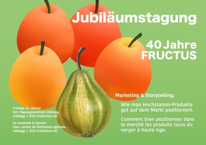 MedienmitteilungMarketing & Storytelling – Wie man Hochstamm-Produkte gut auf dem Markt positioniert.2024-12-16T09:30:40Medienmitteilung «Marketing & Storytelling – Wie man Hochstamm-Produkte gut auf dem Markt positioniert.» FRUCTUS feiert 2025 das 40-Jahre-Jubiläum des Engagements für die Obstsortenvielfalt. Zum Auftakt dieses besonderen Jahres läd FRUCTUS am Freitag 31. Januar 2025 zur Jubiläums-Tagung: "Marketing & Storytelling: Wie man Hochstamm-Produkte gut auf dem Markt positioniert" ein. Thematisch setzt sich die Tagung mit innovativen Hochstamm-Produkten und Vermarktungsstrategien auseinander. Der Tag wird geprägt von vielfältigen Referierenden aus den Bereichen Marketing, Landwirtschaft, Gastronomie, IT und Fotografie. Der Nachmittag wird mit vier praxisorientierten Workshops interaktiv gestaltet. Bitte geben Sie ihre Präferenz bei der Anmeldung an. Die Tagung wird simultan übersetzt (Deutsch/Französisch bzw. Französisch/Deutsch). Die Jubiläums-Tagung richtet sich an alle, die sich für den Erhalt von Hochstämmen und alten Obstsorten interessieren, sowie insbesondere an Produzierende von Hochstammprodukten, Pomologinnen und Pomologen, Fördererinnen und Förderer von FRUCTUS, Vertreterinnen und Vertreter aus Politik und Beratung, Aktive aus NGOs und Gartenbaufirmen der Hochstamm-Branche. Interessierte nutzten zur Anmeldung vor dem 6. Januar das Formular auf der https://www.fructus.ch/fachtagung/ bzw. melden sich Montag oder Dienstag telefonisch unter +41 (0)44 518 03 40. Die Teilnahmegebühr beträgt 90.- CHF für Nicht-Mitglieder und 70.- CHF für Mitglieder von Fructus. Nele Kemper (Öffentlichkeitsarbeit FRUCTUS) FRUCTUS, die Vereinigung zur Förderung alter Obstsorten, ist ein gemeinnütziger Verein mit über 1100 Mitgliedern. Er wurde 1985 gegründet und verbindet Obstfachleute und Obst-Interessierte auf nationaler und internationaler Ebene. FRUCTUS ist die Kompetenzorganisation für alte Obstsorten und den Hochstamm-Obstbau. Sie beschreibt und bewertet die Eigenschaften von alten Obstsorten im Hinblick auf ihre Nutzung, sensibilisiert die Öffentlichkeit für die Vielfalt der Obstsorten und trägt dazu bei, die Biodiversität im Bereich Nutzpflanzen zu erhalten. www.fructus.ch Nele Kemper Öffentlichkeitsarbeit FRUCTUS Jubiläumstagung und weitere Anlässe 044 518 03 42 nele.kemper@fructus.ch Markus Kellerhals Co-Präsident Vereinigung FRUCTUS Vereinigung FRUCTUS und ihre Projekte 079 586 27 92 Permalink:
