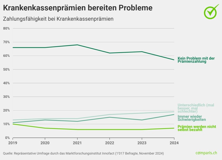 Noch nie hatten mehr Leute Schwierigkeiten, ihre Krankenkassenprämien zu bezahlen, als 2024 – jede dritte Person ist davon betroffen. Das zeigt eine repräsentative Befragung von Comparis. «Obwohl sich die finanzielle Situation für die Mehrheit der Schweizerinnen und Schweizer nicht grundsätzlich verschlechtert hat, drücken Einzelposten wie die Krankenkassenprämien massiv aufs Portemonnaie», sagt Comparis-Consumer-Finance-Experte Michael Kuhn. Entsprechend rechnen 2025 mehr Personen mit einer Verschlechterung als mit einer Verbesserung ihrer finanziellen Situation. Vor allem Befragte mit geringem Einkommen sind pessimistisch.