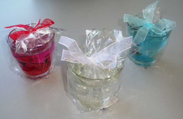 Gelkerze im Glas, in den Farben blau, rot, mintgrün und weiss (farblos), Ø 6,5cm, Höhe 6,5cm - Artikelnummer 6765.157, Verkaufspreis 2.00 Franken.