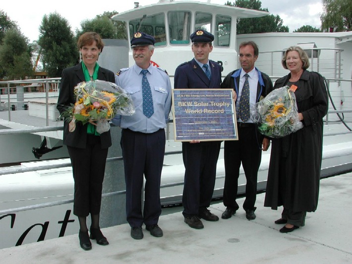 MedienmitteilungBKW - Solartrophy: Weltrekord mit dem weltgrössten Solarschiff MobiCat2001-09-02T12:43:37Bern (ots) - Querverweis auf Bild: www.newsaktuell.ch/d/galerie.htx?type=obs Im Rahmen der BKW-Solartrophy hat das weltgrösste Solarschiff MobiCat am Samstag auf dem Bielersee einen Weltrekord aufgestellt. Erstmals ist es einem ausschliesslich photovoltaisch betriebenen Schiff gelungen, über 100 Passagiere in 60 Minuten über eine 10 Kilometer Strecke mit dem Rekordwert von nur 22 Wattstunden pro Passagier-Kilometer zu transportieren. Die von der BKW FMB Energie AG in Anwesenheit prominenter Zeuginnen erfasste energetische Spitzenleistung wird im Guinnessbuch der Rekorde zum Eintrag gelangen. Ausgeschrieben wurde die BKW-Solartrophy von der BKW FMB Energie AG Bern/Schweiz als "Internationaler Solarwettbewerb zur intelligenten Mobilität für Personentransportschiffe". Die von den beiden prominenten Zeuginnen Ständerätin Christine Beerli und Regierungsrätin Dori Schaer-Born überwachte Rekordleistung beruht einerseits auf der modernen Energietechnik des MobiCat und anderseits auf der meisterhaften Fahrweise von Michel Scheurer, Kapitän der Bielersee-Schifffahrts-Gesellschaft (BSG). Die BSG erhielt als Betreiberin des weltgrössten Solarschiffes von der veranstaltenden BKW FMB Energie AG die BKW-Solartrophy ausgehändigt. Sie wird zudem im internationalen Fotovoltaik-Forschungs-Zentrum Mont-Soleil im Berner Jura auf der "goldenen Tafel" als erste Weltrekordhalterin aufgeführt werden. Die vom weltgrössten Solarschiff MobiCat erzielten Weltrekordwerte: 110 Passagiere (über 18 Jahre alt) 59:55 Minuten 10 Kilometer 24, 2 kWh Energieverbrauch insgesamt Rekordwert: 22 Wattstunden pro Passagier-Kilometer Kontakt: BKW FMB Energie AG Permalink: