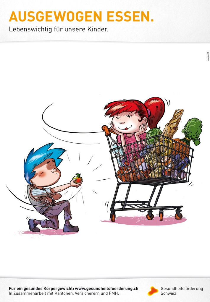 unter: http://www.presseportal.ch/de/pm/100001194 -Gesundheitsförderung Schweiz führt ihre Kampagne "Gesundes Körpergewicht" weiter. Die vierte Phase, die am 15. März lanciert wird, setzt auf Humor und Comics, um Eltern und Kinder für mehr Bewegung und eine ausgewogene Ernährung zu gewinnen. Ein Junge mit schriller Frisur hängt an einem Basketballkorb und getraut sich nicht mehr runter. Darüber die Botschaft "Sich täglich bewegen ist lebenswichtig für unsere Kinder". Die neue Folge der Kampagne "Gesundes Körpergewicht" kommt mit einem Augenzwinkern und viel Witz daher. Die Sujets werden in der zweiten Märzhälfte an Plakatwänden in der ganzen Schweiz hängen und eine besorgniserregende Tatsache in Erinnerung rufen. Viele Kinder in der Schweiz bewegen sich zu wenig und ernähren sich schlecht. Die Folgen: Übergewicht und Fettleibigkeit werden immer stärker zu einem gesellschaftlichen Problem. Rund ein Drittel der Menschen in der Schweiz bringen zu viel Gewicht auf die Waage, was zu gesundheitlichen Schäden führen kann. Die Kosten, die daraus für die Gesellschaft erwachsen, liegen in Milliardenhöhe. Humor statt Mahnfinger Gesundheitsförderung Schweiz will in ihrer Kampagne, die neben Plakaten auch Inserate in grossen Publikumszeitschriften umfasst, nicht den Mahnfinger erheben. "Wir wollen Eltern und Kinder mit positiven Botschaften und mit einer Mischung von Humor und Seriosität dazu motivieren, im Alltag auf ausgewogenes Essen und viel Bewegung zu achten", erklärt Thomas Mattig, Direktor von Gesundheitsförderung Schweiz. Die schelmischen Comicfiguren, die als Sympathieträger der Kampagne die Herzen von jung und alt erobern sollen, suggerieren, dass Änderungen im persönlichen Lebensstil zwar nicht kinderleicht aber doch für alle machbar sind. Nachdem die Kampagne "Gesundes Körpergewicht" in früheren Jahren mit Sujets wie einem überbreiten Schlitten oder einem XXL Stuhl für Klassenzimmer für Aufsehen sorgte, bringt die neue Serie von Plakaten und Inseraten einen Wechsel in Tonalität und Stil. Die Strategie: Humor als Mittel zur Sensibilisierung. Die Comics dienen als Türöffner zu den angesprochenen Eltern und Kinder, denn Comics werden von allen verstanden und schliessen niemanden aus. Die gewitzte Zeichenfigur mit ihren blauen Haaren agiert gewissermassen als Stellvertreter, der die komplexe Umwelt, in der wir uns bewegen, vereinfacht. Anstrengungen der Kantone unterstützen Die Kampagne wurde von der Agentur numéro10 konzipiert und in Zusammenarbeit mit den Kantonen, den Versicherern und den FMH umgesetzt. Schöpfer der Kampagnen-Figur ist der Illustrator Jared Muralt, vom Berner Designbüro BlackYard. Der 1982 geborene Gestalter ist seit seiner Kindheit begeisterter Comic-Zeichner und gilt als eines der grossen Talente in der Schweizer Illustratoren-Szene. Die Kampagne von Gesundheitsförderung Schweiz unterstützt die Anstrengungen der kantonalen Aktionsprogramme "Gesundes Körpergewicht". Diese richten sich an Kinder und Jugendliche von 0 bis 20 Jahren sowie an Eltern, werdende Eltern und Lehrpersonen. Zu den Aufgaben von Gesundheitsförderung Schweiz zählt nicht nur die Sensibilisierungsarbeit. Die Organisation erfüllt auch einen nationalen Auftrag im Rahmen des Programms für Ernährung und Bewegung (NPEB) des Bundes. Gesundheitsförderung Schweiz initiiert und koordiniert die kantonalen Aktionsprogramme für ein gesundes Körpergewicht. Und dies mit wachsendem Erfolg: Machten 2007 erst sechs Kantone bei den Aktionsprogrammen mit, waren es 2009 bereits 22. Somit gibt es in der Schweiz bald flächendeckend Programme von Aktionen, die auf ein gesundes Körpergewicht hinwirken. Über Gesundheitsförderung Schweiz Gesundheitsförderung Schweiz ist eine nationale Stiftung, die von Kantonen und Versicherern getragen wird. Mit gesetzlichem Auftrag initiiert, koordiniert und evaluiert sie Massnahmen zur Förderung der Gesundheit (Krankenversicherungsgesetz, Art. 19). Die Geschäftsstelle besteht aus Büros in Bern und Lausanne.Jede Person in der Schweiz leistet einen jährlichen Beitrag von CHF 2.40 zugunsten von Gesundheitsförderung Schweiz, der von den Krankenversicherern für die Stiftung eingezogen wird. www.gesundheitsfoerderung.ch Kontakt: Csongor Kozma, Gesundheitsförderung Schweiz Permalink: