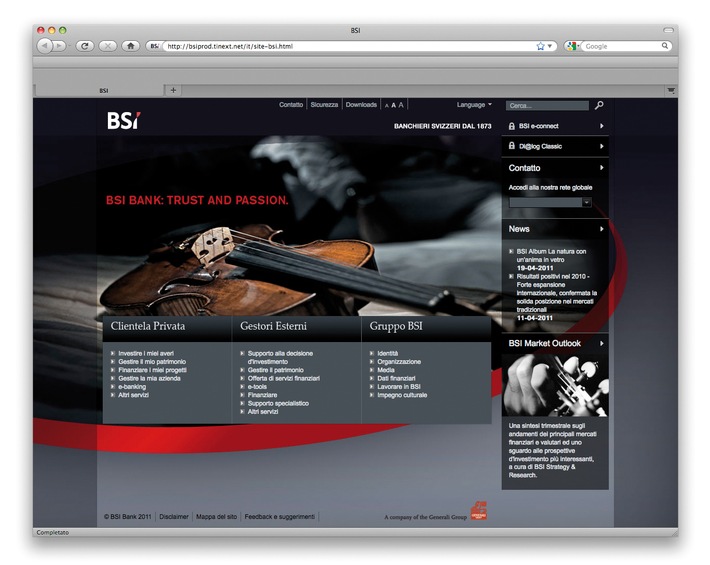 Die BSI AG wurde 1873 in Lugano (Schweiz) gegründet. Sie ist eine der ältesten Banken in der Schweiz und auf das Private Wealth Management spezialisiert. Seit 1998 wird BSI vollumfänglich von der Generali Gruppe kontrolliert, einem der weltweit führenden Versicherungs- und Finanzkonzerne. Dem Aufbau und der Pflege dauerhafter Kundenbeziehungen schenkt die Bank besondere Aufmerksamkeit. Gleichzeitig stellt sie ihren Kunden eine umfassende Vermögensverwaltung mit erstklassigen Produkten zur Verfügung. Sie ist an den wichtigsten internationalen Finanzplätzen in Europa, in Lateinamerika, im Nahen Osten und in Asien vertreten. www.bsibank.com