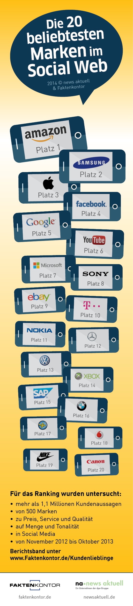 Wenn es um Preis, Service und Qualität geht, dann ist das Online-Kaufhaus Amazon die beliebteste Marke im deutschsprachigen Social Web. Auf Platz Zwei findet sich Smartphone-Hersteller Samsung, gefolgt von Apple. Das ergab eine gemeinsame Analyse der dpa-Tochter news aktuell und Faktenkontor. Dafür wurden mehr als 1,1 Millionen Konsumentenaussagen im Hinblick auf Menge und Tonalität ausgewertet. Insgesamt 500 Marken standen im Fokus der groß angelegten Studie.