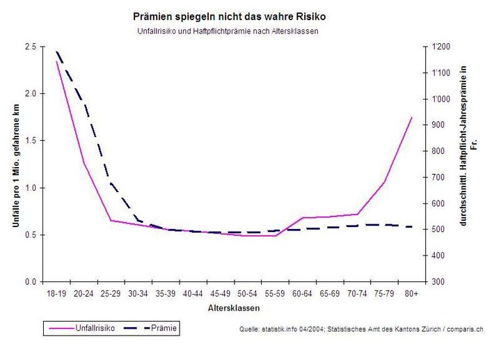 MedienmitteilungComparis: Ältere fahren schlechter und dennoch günstiger - Alte Lenker bezahlen zu wenig Autohaftpflicht - auf Kosten der übrigen Versicherten2004-04-25T12:00:00Zürich (ots) - Querverweis auf Grafik: www.newsaktuell.ch/d/galerie.htx?type=ogs Wie die jungen Lenker haben auch die alten Automobilisten ein höheres Unfallrisiko - doch nur die Jungen bezahlen entsprechend höhere Haftpflichtprämien. Dies weist eine breit abgestützte Untersuchung von comparis.ch nach. Ältere Automobilisten haben entgegen bisheriger Annahmen ein höheres Unfallrisiko als Angehörige der mittleren Altersklassen. Diese Erkenntnis aus einer schweizweiten Studie publizierte das Statistische Amt des Kantons Zürich vergangene Woche. Den Internet-Vergleichsdienst comparis.ch bewog dies zur Frage, ob die Autoversicherungsprämien diesem Umstand Rechnung tragen. Bekanntlich zahlen junge Lenker, die ebenfalls stärker unfallgefährdet sind, wesentlich höhere Haftpflichtprämien als die restlichen Versicherten. Stellen die Versicherungen das erhöhte Unfallrisiko auch den alten Lenkern in Rechnung ? Mit einer Auswertung von rund 200'000 Prämienvergleichen, die über 1,5 Millionen Haftpflichtprämien umfassen, dokumentiert comparis.ch, dass dies nicht der Fall ist. Die tatsächlichen Prämien spiegeln lediglich das Unfallrisiko der jungen, nicht aber jenes der alten Lenker, wie die Grafik zeigt. Obwohl beide Gruppen ein erhöhtes Unfallrisiko tragen (ausgezogene Kurve), bezahlen nur die jungen Lenker höhere Haftpflichtprämien, während die alten Lenker von zu günstigen Prämien profitieren (gestrichelte Kurve). Mit anderem Worten: Heute bezahlen nur die unter 60jährigen Lenker eine dem Unfallrisiko ihrer jeweiligen Altersklasse angepasste Prämie, die über 60jährigen Lenker müssen den Risikozuschlag, der ihrer Altersgruppe angemessen wäre, nicht berappen. «De facto bedeutet dies eine gross angelegte Umverteilung», stellt Comparis-Geschäftsführer Richard Eisler fest, «bei der die älteren Versicherten von allen übrigen Versicherten subventioniert werden.» Breite Datengrundlage Basis der Comparis-Studie sind rund 200'000 Vergleiche von Autoversicherungsprämien, welche Kunden von comparis.ch im Internet durchgeführt haben. Aus den jeweils sieben bis acht verglichenen Prämien wurde für jeden der rund 200'000 Fälle eine durchschnittliche Autohaftpflichtprämie berechnet. Diese floss in die jeweilige Alterskategorie der obigen Grafik ein. Kontakt: Richard Eisler Permalink: