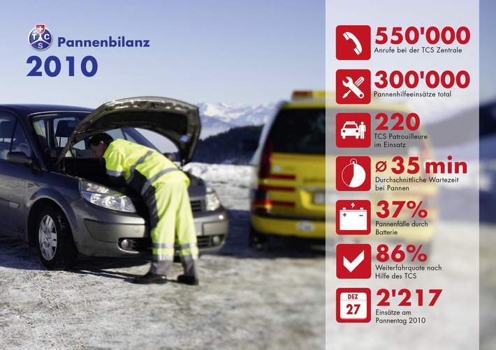 Obwohl die Automobilbranche die Qualität und Technologie ihrer Fahrzeuge kontinuierlich weiterentwickelt, blieb die Zahl der Pannen auf Schweizer Strassen gemäss der Pannenbilanz vom TCS mit rund 300'000 Einsätzen auch im Jahr 2010 auf hohem Niveau. Das heisst, der TCS erledigte schweizweit durchschnittlich über 800 Pannen pro Tag. Die meisten Pannen wurden wie immer in den Ferienmonaten im Sommer und Winter registriert. Der pannenreichste Tag des Jahres war kurz vor Jahresende am 27. Dezember 2010, als viele Einwohner den ersten schönen Tag nach den Feiertagen für einen Ausflug mit ihren Fahrzeugen nutzten.