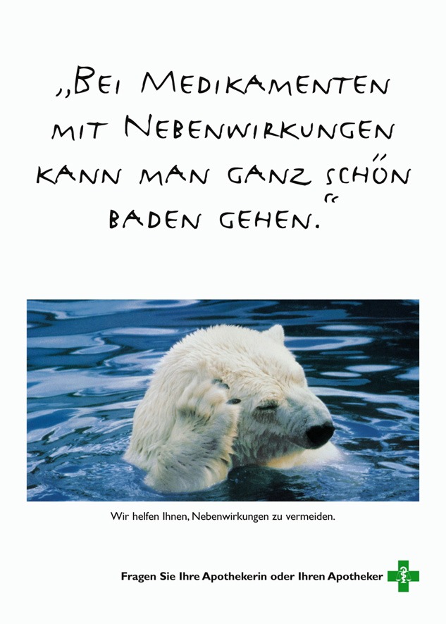 MedienmitteilungSchweizerischer Apothekerverband: Unerwünschte Nebenwirkungen bei Medikamenten - Da kann man ganz schön baden gehen!2004-06-03T13:10:00Bern-Liebefeld (ots) - Hinweis: Das Plakatsujet "Eisbär" kann unter www.newsaktuell.ch/d